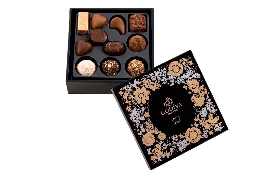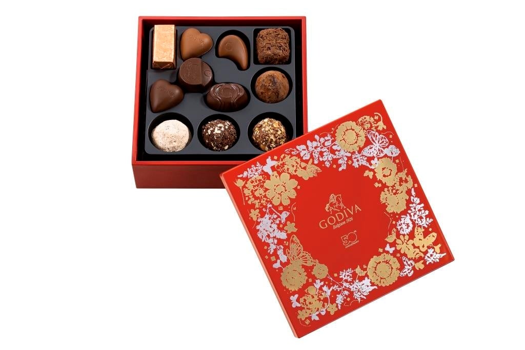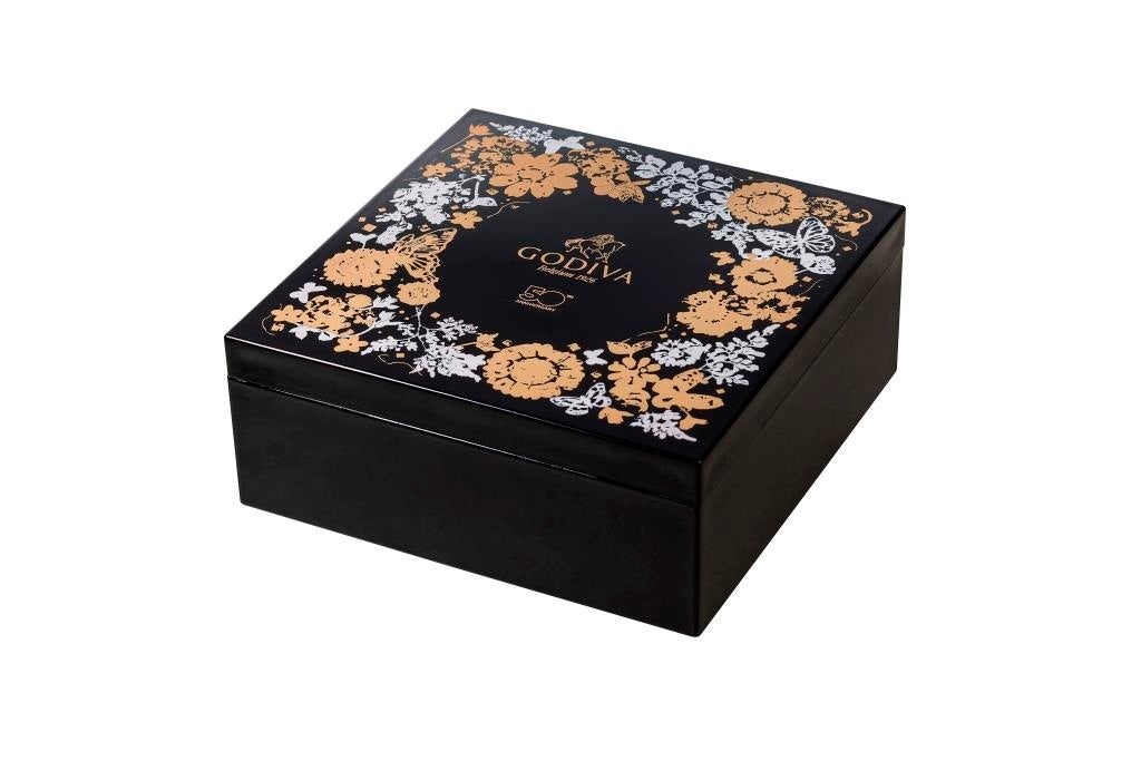 ゴディバ日本上陸50周年を記念した、創業者ピエール・ドラップスの秘伝のトリュフやチョコレートを、宮内庁御用達の山田平安堂謹製チョコレートボックスに詰め合わせました。