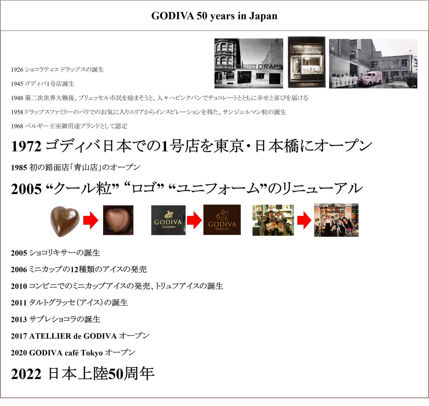 その当時、日本にはまだ大人が楽しむプレミアムチョコレートはほとんどありませんでしたが、ベルギーから来たゴディバは日本の皆さまに温かく迎え入れられ、50年後の今でも愛されつづけています。