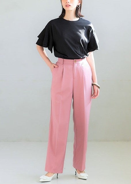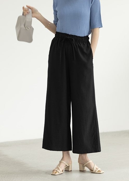 コーデに合わせやすいベーシックなストレートシルエットで、ウエストは総ゴム&リボン紐付きです。