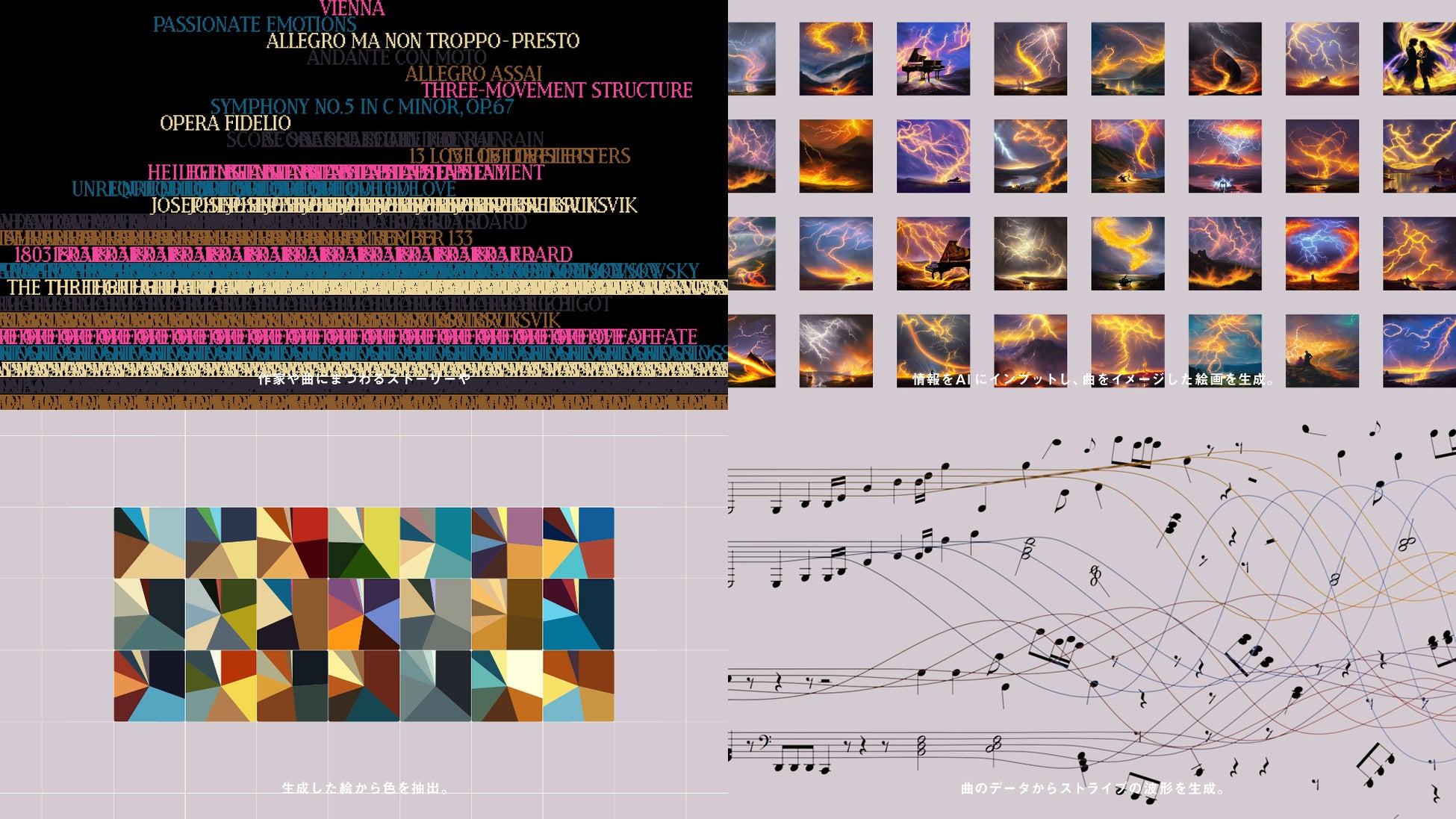 ・楽曲全体の特徴(感情、テンポ、音色など)を基に、生成AIがその楽曲を視覚的に表現する「絵画」を作成