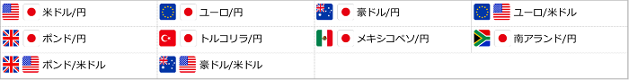 米ドル/円・ユーロ/円・豪ドル/円・ユーロ/米ドル・ポンド/円・トルコリラ/円・メキシコペソ/円・南アランド/円・ポンド/米ドル・豪ドル/米ドル