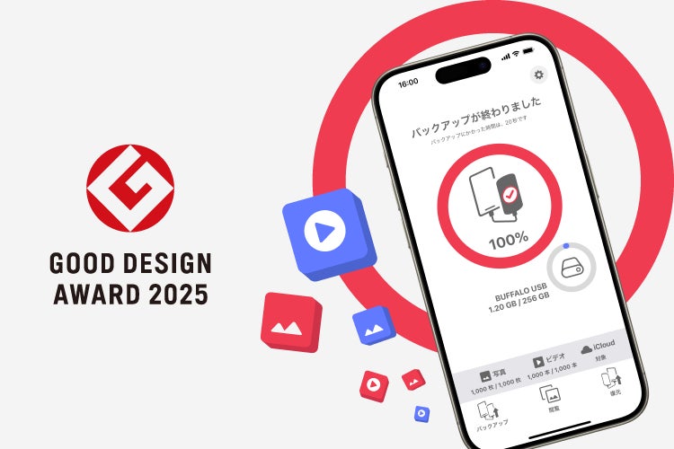 株式会社バッファロー(本社:東京都千代田区、代表取締役 社長執行役員CEO:牧 寛之)が提供する、スマートフォンに保存している写真・ビデオを外部USBストレージにバックアップ(データのコピー)できる無料のアプリケーション「写真バックアップ」が、「2025年度グッドデザイン賞(主催:公益財団法人日本デザイン振興会)」を受賞しました。今回の受賞でバッファローは9年連続の受賞となりました。
