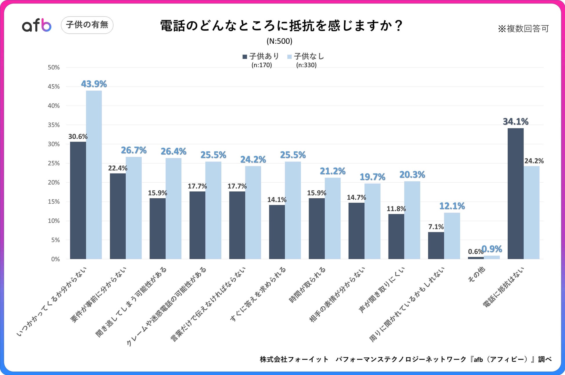 子供の有無で見ると、子供がいない方は電話に抵抗を感じる割合が高くなるという結果になりました。最も差が大きかった項目は「いつかかってくるか分からない」で、子供がいない方の回答率が10%以上高くなっています。子供が生まれて幼稚園や保育園、学校に通う年齢になると、さまざまな連絡を電話でする機会も増えることが考えられます。その一方で、子供がいない場合は日常的に電話を使用することが比較的少ない傾向にあり、抵抗を感じる方が一定数いるのかもしれません。