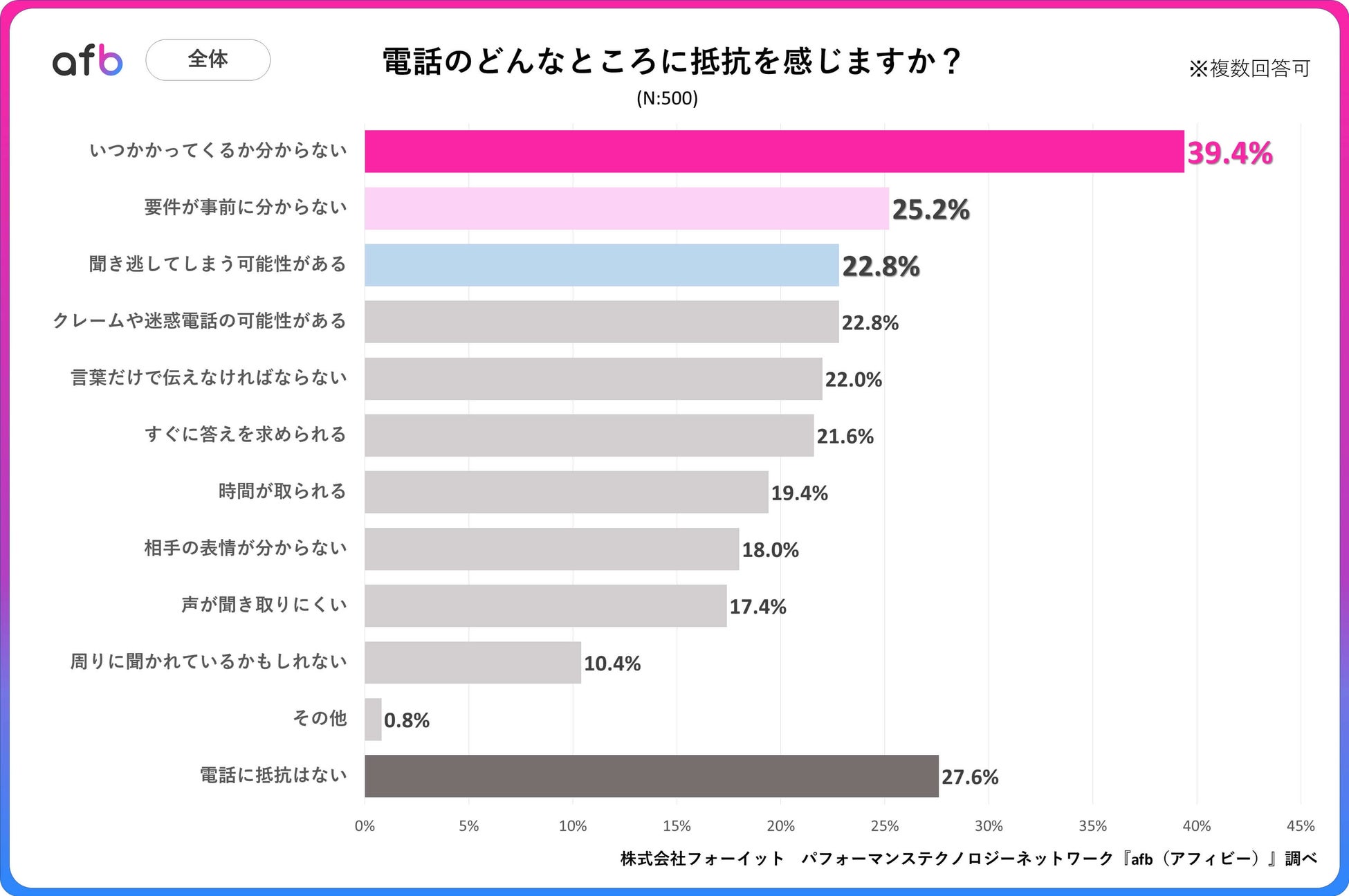 全国の20代〜60代の男女を対象に、「電話のどんなところに抵抗を感じますか?」というアンケートを実施したところ、最も多かった回答は「いつかかってくるか分からない」で、39.4%でした。次いで、「要件が事前に分からない」が25.2%、「聞き逃してしまう可能性がある」と「クレームや迷惑電話の可能性がある」が22.8%で続くという結果になりました。また、「その他」として「相手が誰か分からない」という回答が得られました。