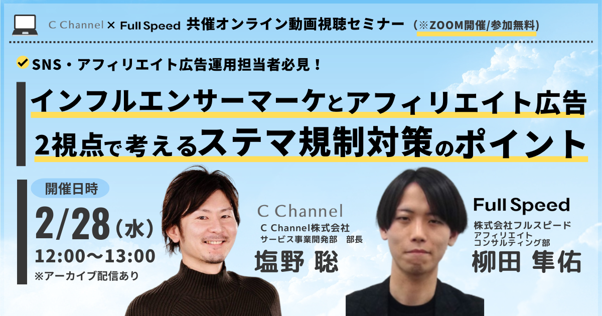 そこで、フルスピード社とC Channel株式会社は共催して「ステマ規制対策セミナー」を開催いたします。本セミナーでは、アフィリエイト広告運用支援実績を持つフルスピード社と、SNS活用やインフルエンサーマーケティングにおける専門知識を有するC Channel株式会社の両社が、それぞれの視点から法規制のポイントや対策の考え方を解説いたします。さらには、法規制実施をふまえ、実際の企業様における具体的な取り組みについてもお話します。