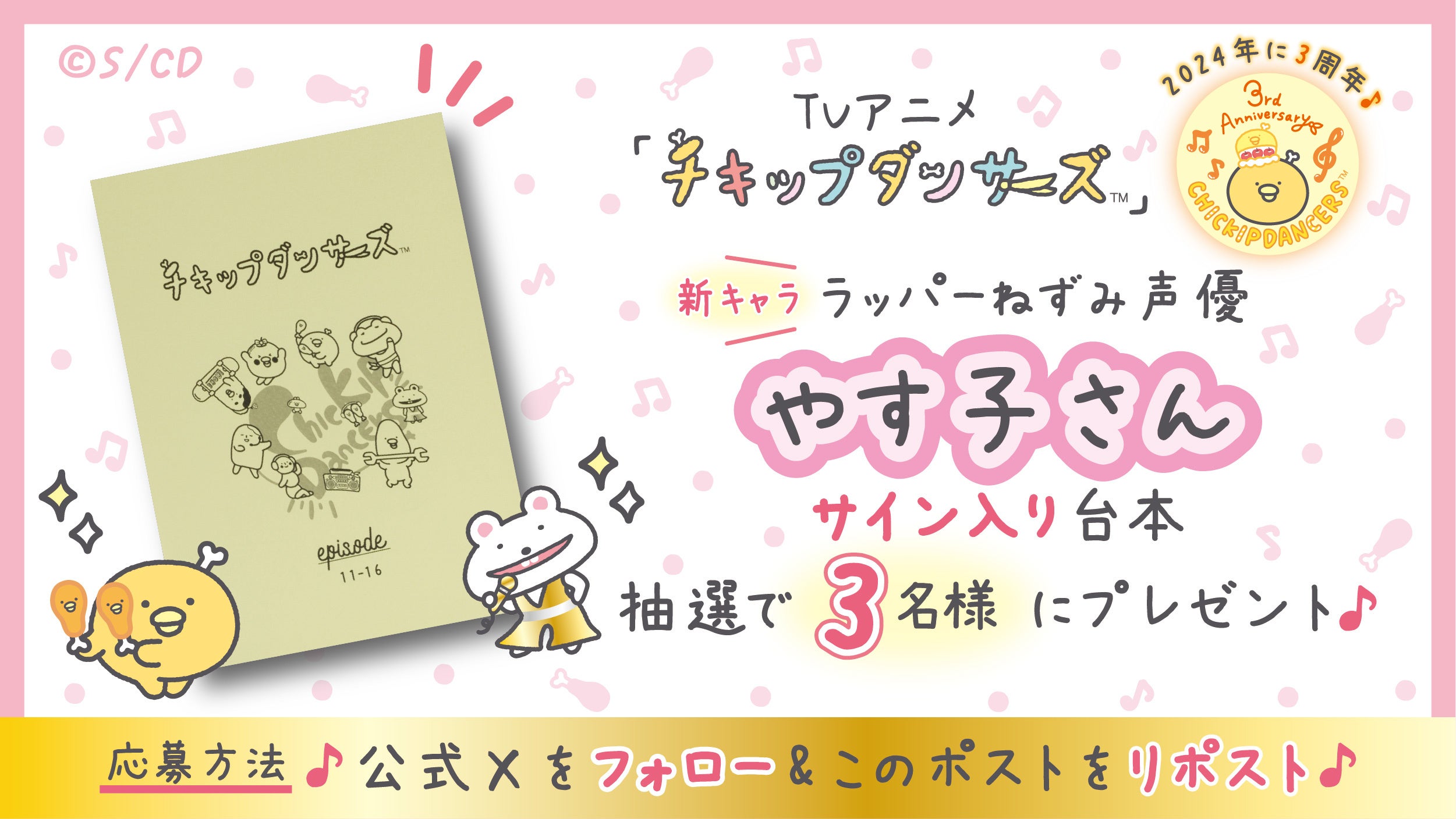 チキップダンサーズ公式Xアカウントをフォロー、対象のポストをリポストすると、「ラッパーねずみ役のやす子さんのサイン入り台本」が抽選で3名様に当たります。