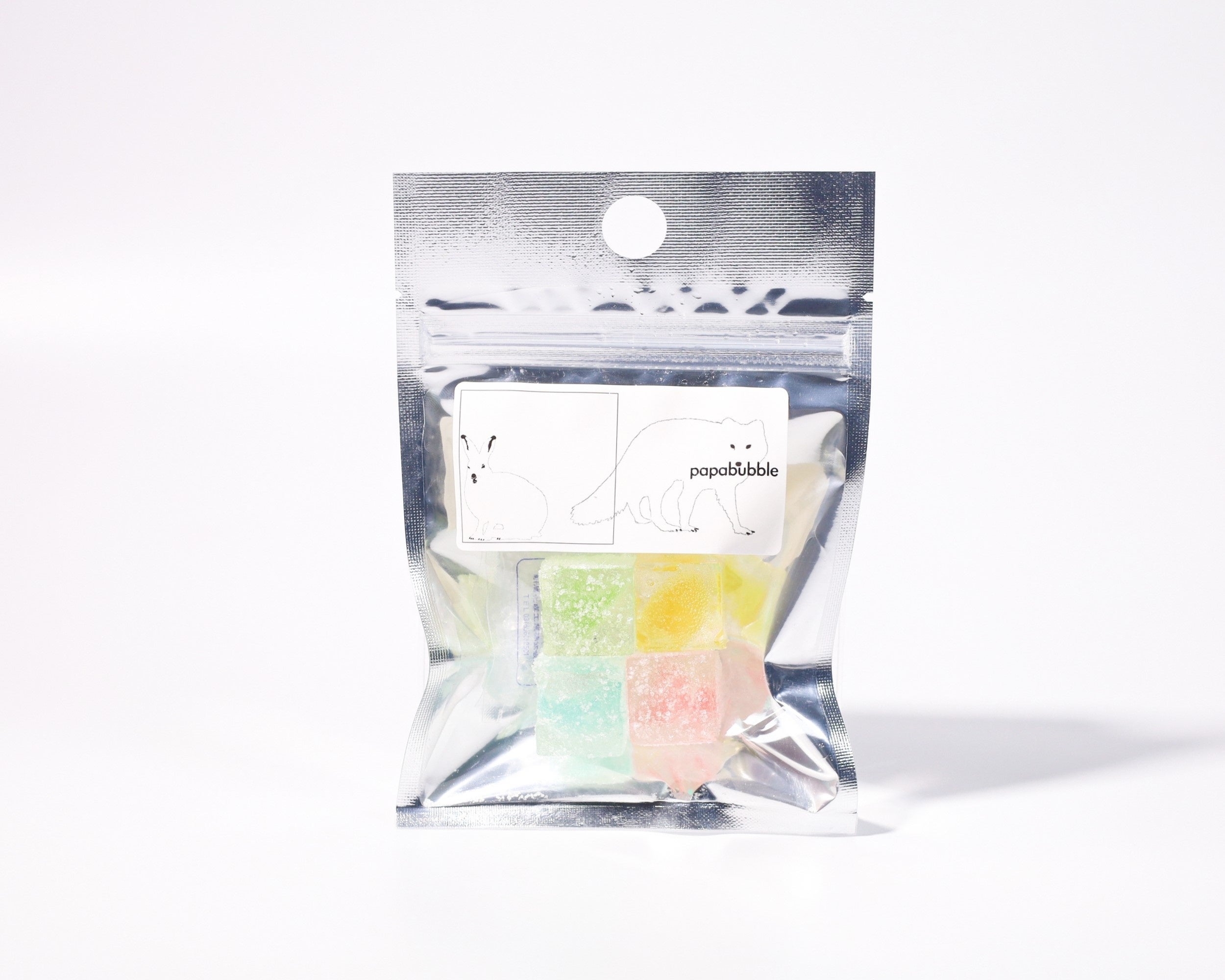 まるで本物の氷のような、目も舌も爽やかな気分になれる、夏のPAPABUBBLEの人気商品が今年も登場です。透明度の高いシャンパンキャンディの中には、酸味が効いたグミが入っており、キャンディの周りにはキシリトールをまとわせています。見た目の清涼感のみならず、舌でも味わえる“ひんやり感覚”をお楽しみください。また、ソーダに入れて少し溶かしながら食べていただくのもおすすめです。フレーバーは、アセロラ・パッションフルーツ・レモン・マスカットの4種をラインナップ。ひんやり気分で、暑い夏を爽やかに過ごせるキャンディです。