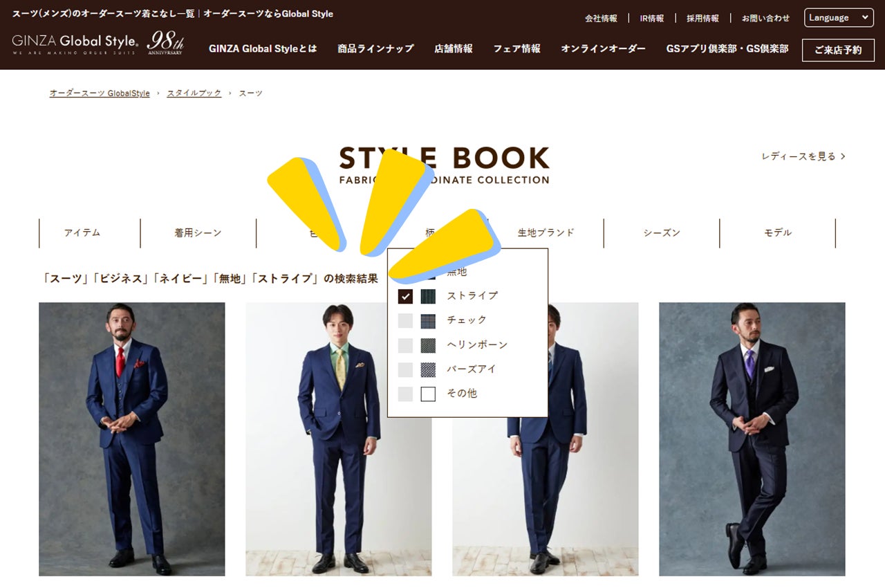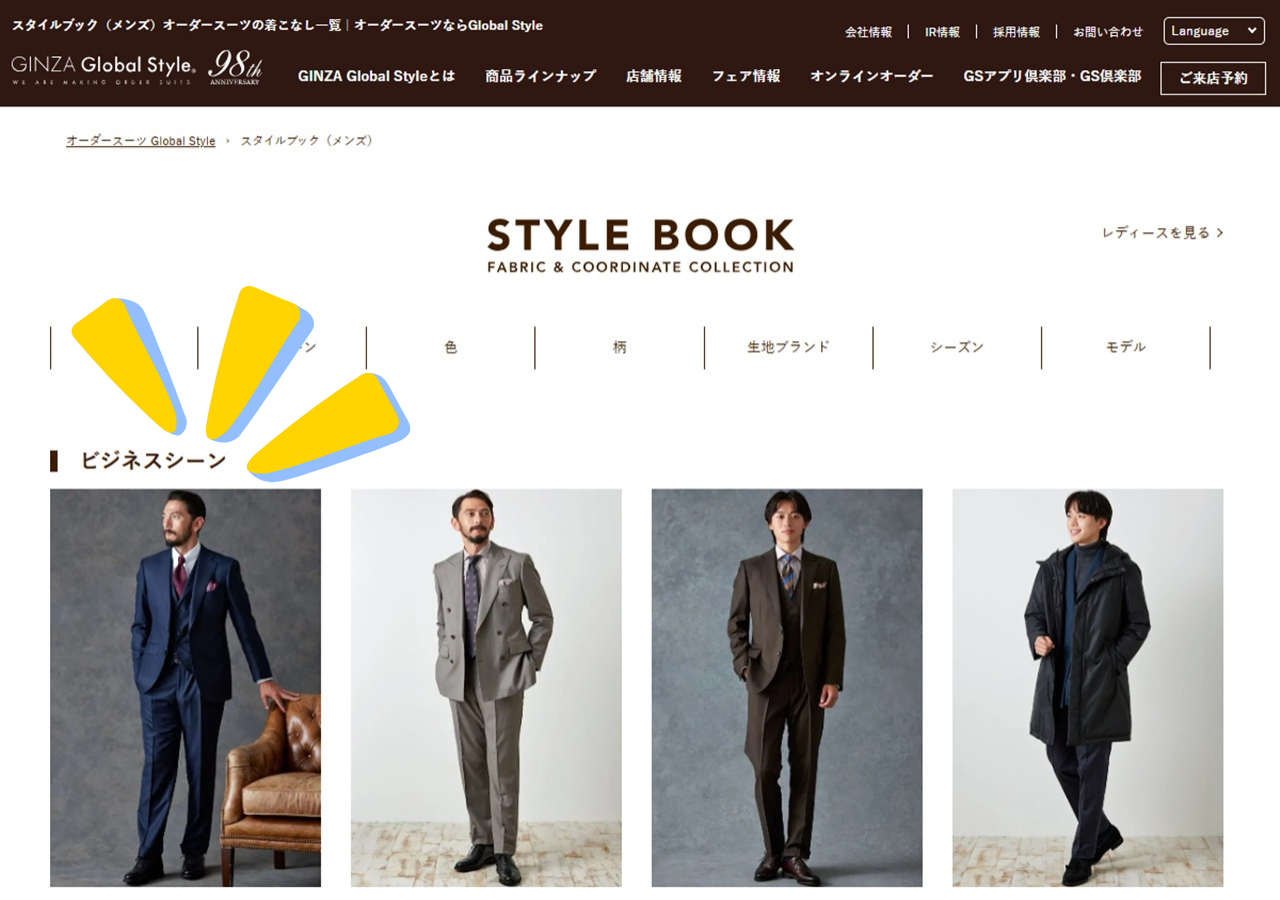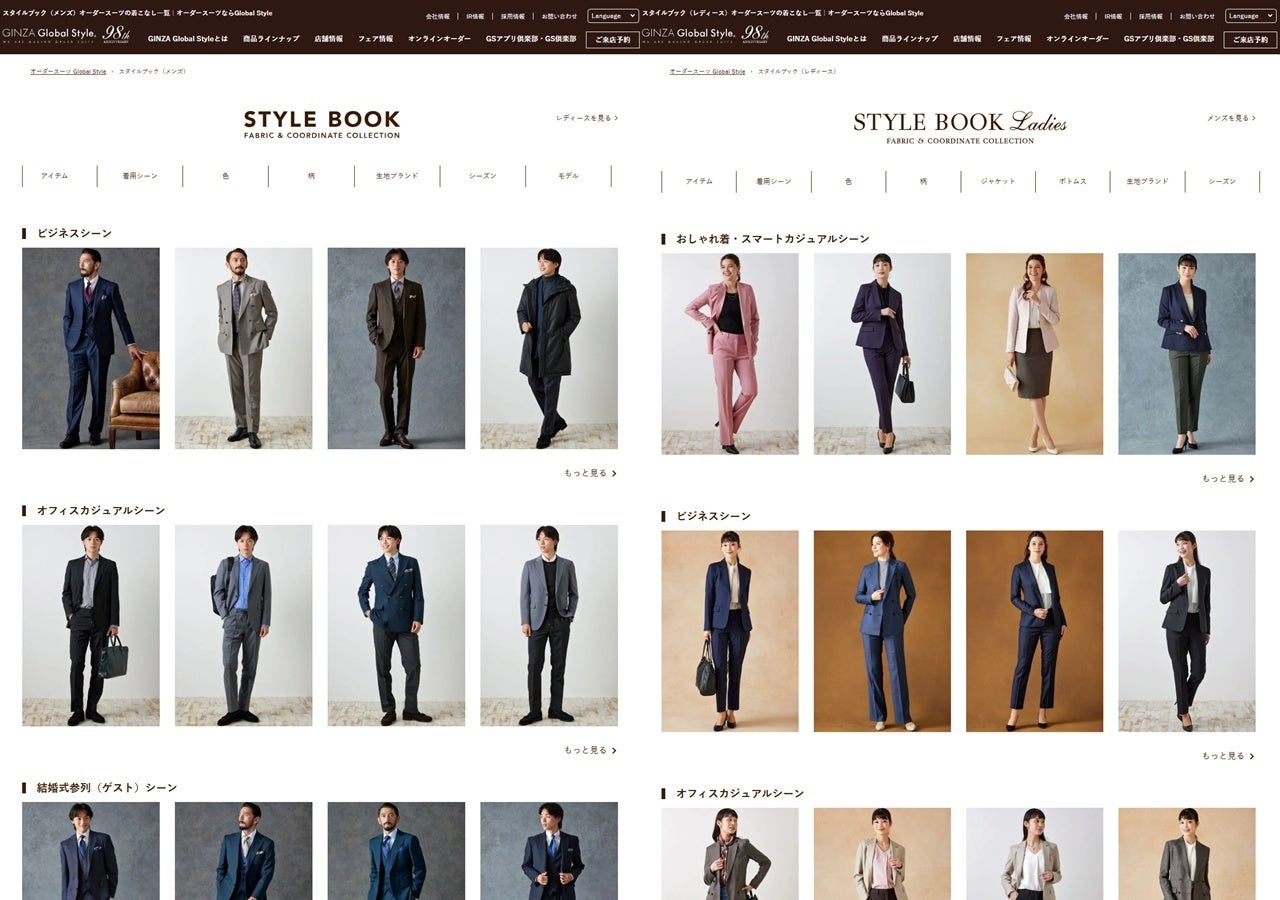 オーダースーツ専門店 グローバルスタイルの『スタイルブック』がアップデート!TPO・着用シーン別にコーディネートを掲載。色・柄やスタイルもより検索しやすく。スーツの仕上がりイメージが一目で分かる!