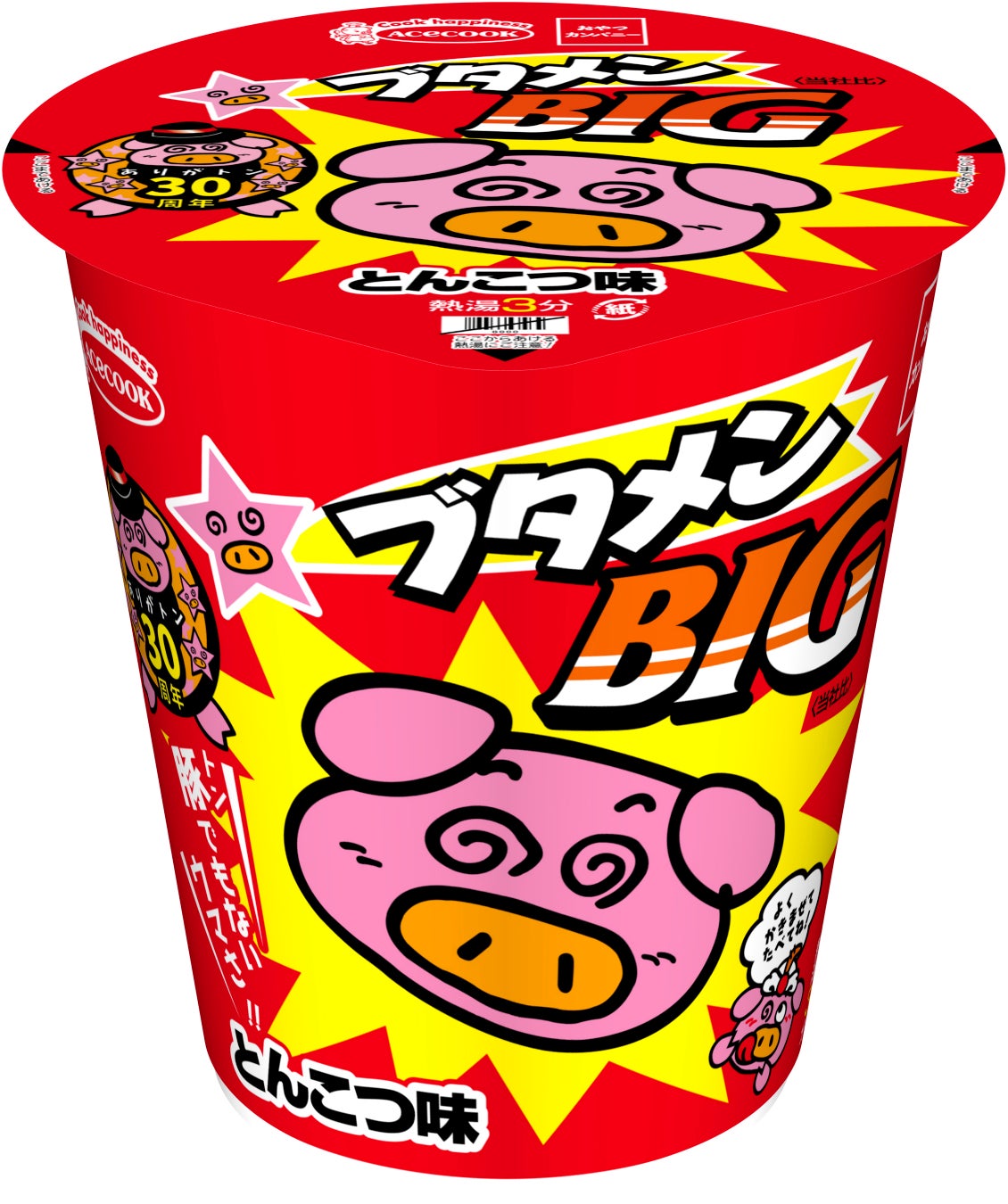 発売30周年企画の第3弾は、ブタメンが巨大化!エースコック株式会社(所在地:大阪府吹田市 代表取締役社長:村岡寛)から、ミニカップ麺ブタメンをBIGサイズにした「ブタメンBIG とんこつ味」が、2023年5月1日(月)より発売されます。