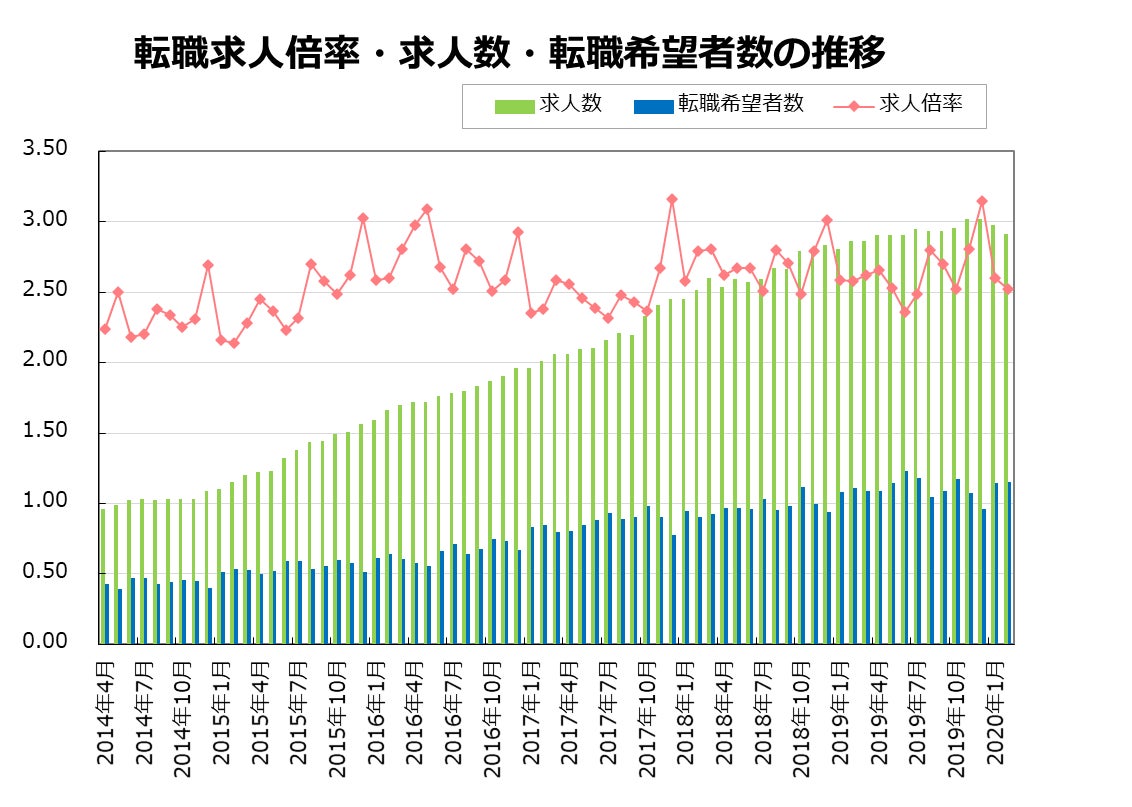 2020年2月の転職求人倍率は、前月比-0.08ポイントの2.52倍となりました。求人数は前月比97.8%、前年同月比101.6%となりました。転職希望者数は前月比100.6%、前年同月比104.0%でした。