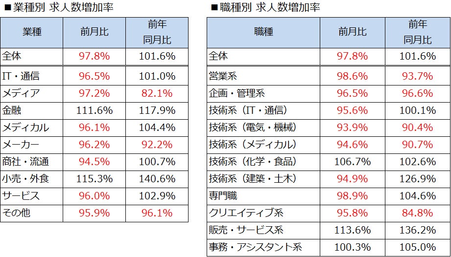 業種別では、「その他」を除く8業種のうち「小売・外食」(前月比115.3%)、「金融」(前月比111.6%)の2業種で求人数が増加しました。職種別では、11職種のうち「販売・サービス系」「技術系(化学・食品)」「事務・アシスタント系」の3職種で求人数が増加しました。求人の増加率が特に高かったのは、「販売・サービス系」(前月比113.6%)、「技術系(化学・食品)」(前月比106.7%)でした。