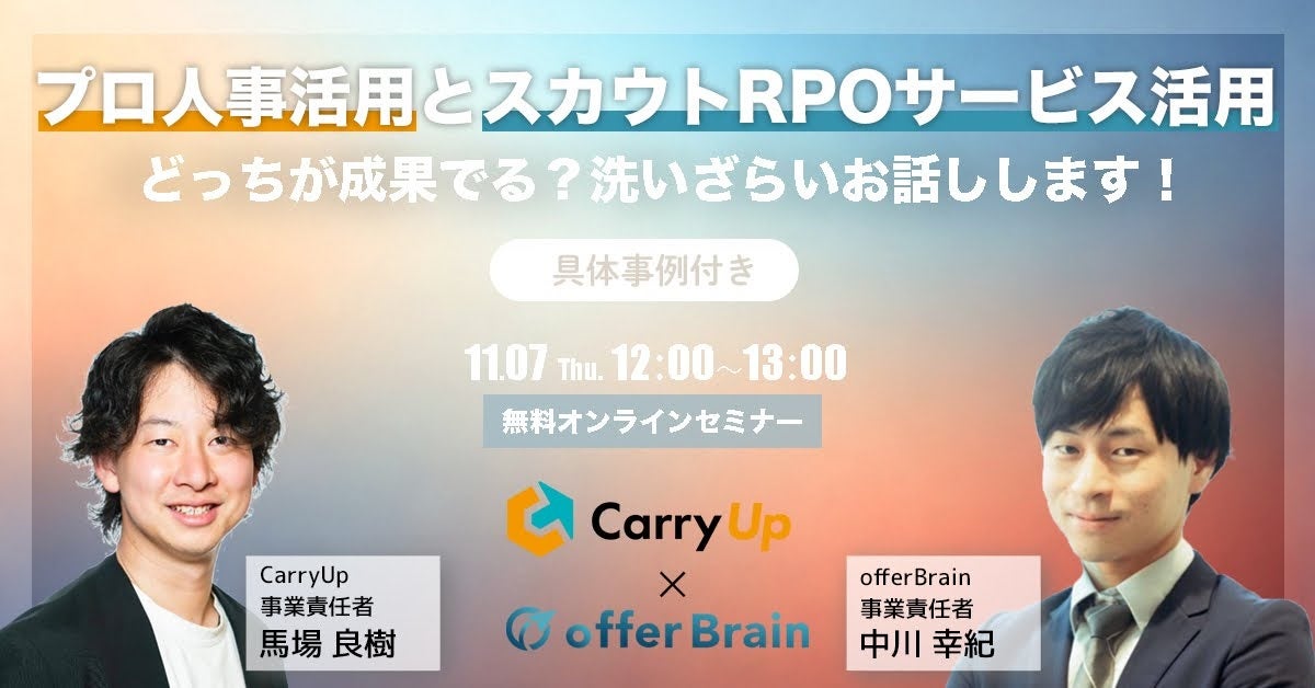 ユナイテッド株式会社(本社:東京都渋谷区、代表取締役社長 兼 執行役員:早川 与規、証券コード:2497)の連結子会社であるユナイテッド・リクルートメント株式会社(本社:東京都渋谷区、代表取締役:金子 陽三)とONX株式会社(本社:東京都渋谷区、代表取締役:馬場 良樹)は、11月7日(木)12:00より、「プロ人事活用とスカウトRPOサービス活用、どっちが成果でるの?洗いざらいお話しします!~具体事例付き~」をテーマに無料ウェビナー開催することをお知らせいたします。