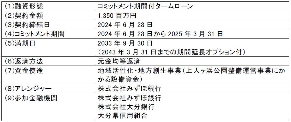 TKPは、大分県別府市のPark-PFI※1事業である上人ヶ浜公園整備運営事業をはじめとした地方創生の取り組みを実施しております。本事業の運営にあたり資金調達を実行するため、本契約を締結いたしました。なお、ソーシャルローンとは、その調達資金を「社会的課題を解決する事業」に充当することを目的としたローンであり、当社はこの度、ソーシャルローン原則※2等に基づき「ソーシャルローン・フレームワーク」を策定、第三者評価機関である株式会社格付投資情報センターから評価※3を得ております。