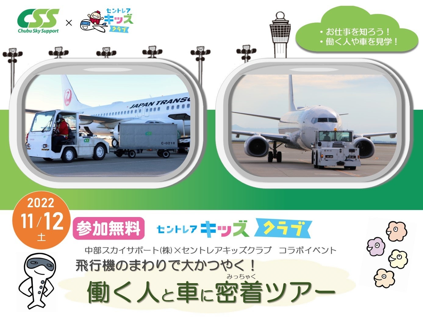 中部国際空港セントレア(所在地:愛知県常滑市)では、セントレアキッズクラブと中部スカイサポート(株)の共同企画として、空港の普段は立ち入ることができないエリアに潜入し、飛行機の周りで大活躍する特殊車両やグランドハンドリングのお仕事を学べる特別な親子見学ツアーを開催します! 飛行機を飛ばすために必要なお仕事を近くで見学することができます。ぜひ親子でご参加ください。