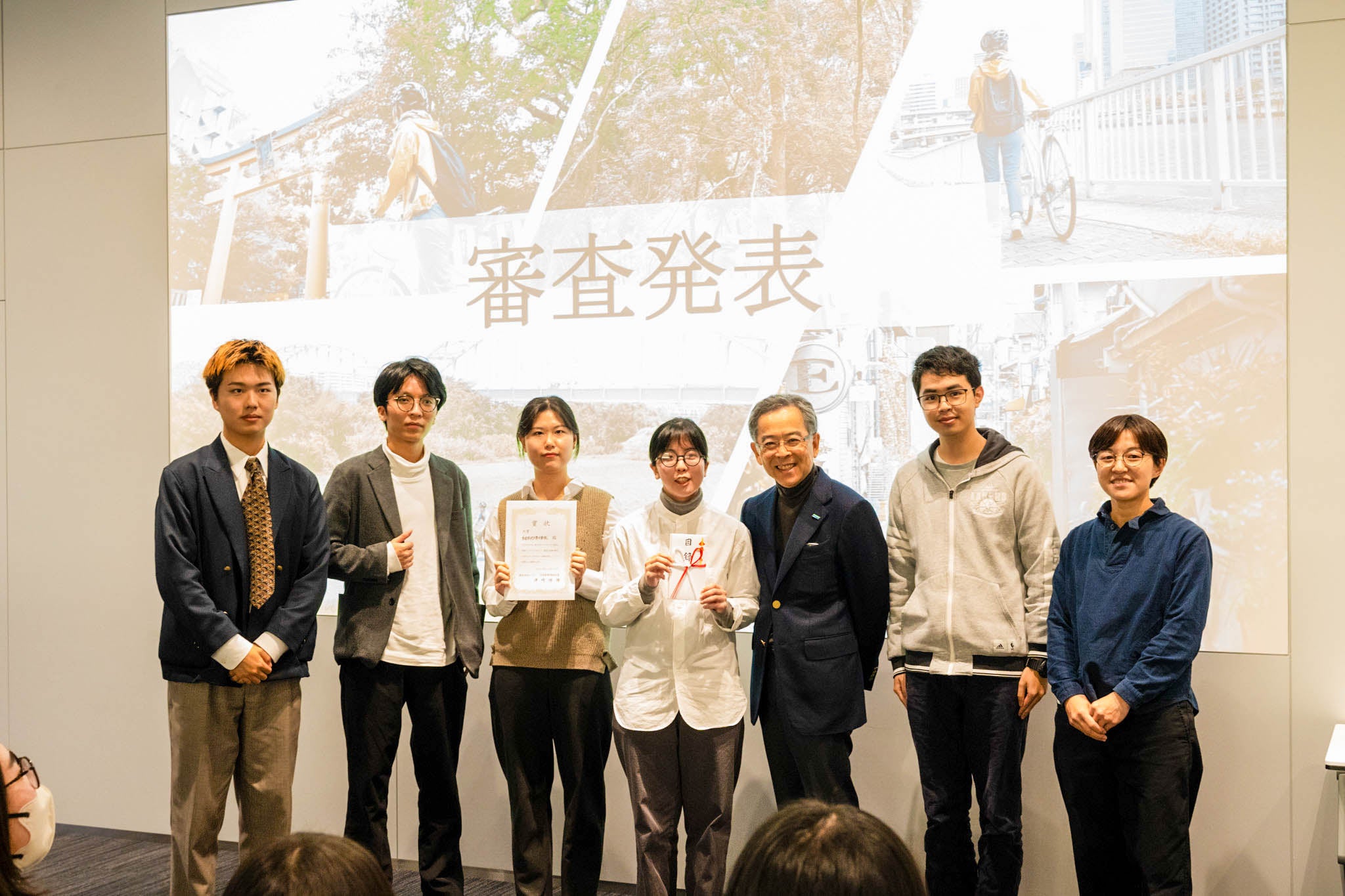 2023年12月16日(土)、シマノ自転車博物館(大阪府堺市)で行われた最終審査会で一次選考を通過した6チームがプレゼンテーションを行い、審査の結果、京都府宇治市での散走プランを発表した本学チームの企画提案「ここにいルンです 宇治きりとり散走」が、最優秀賞の「大賞」に輝きました。