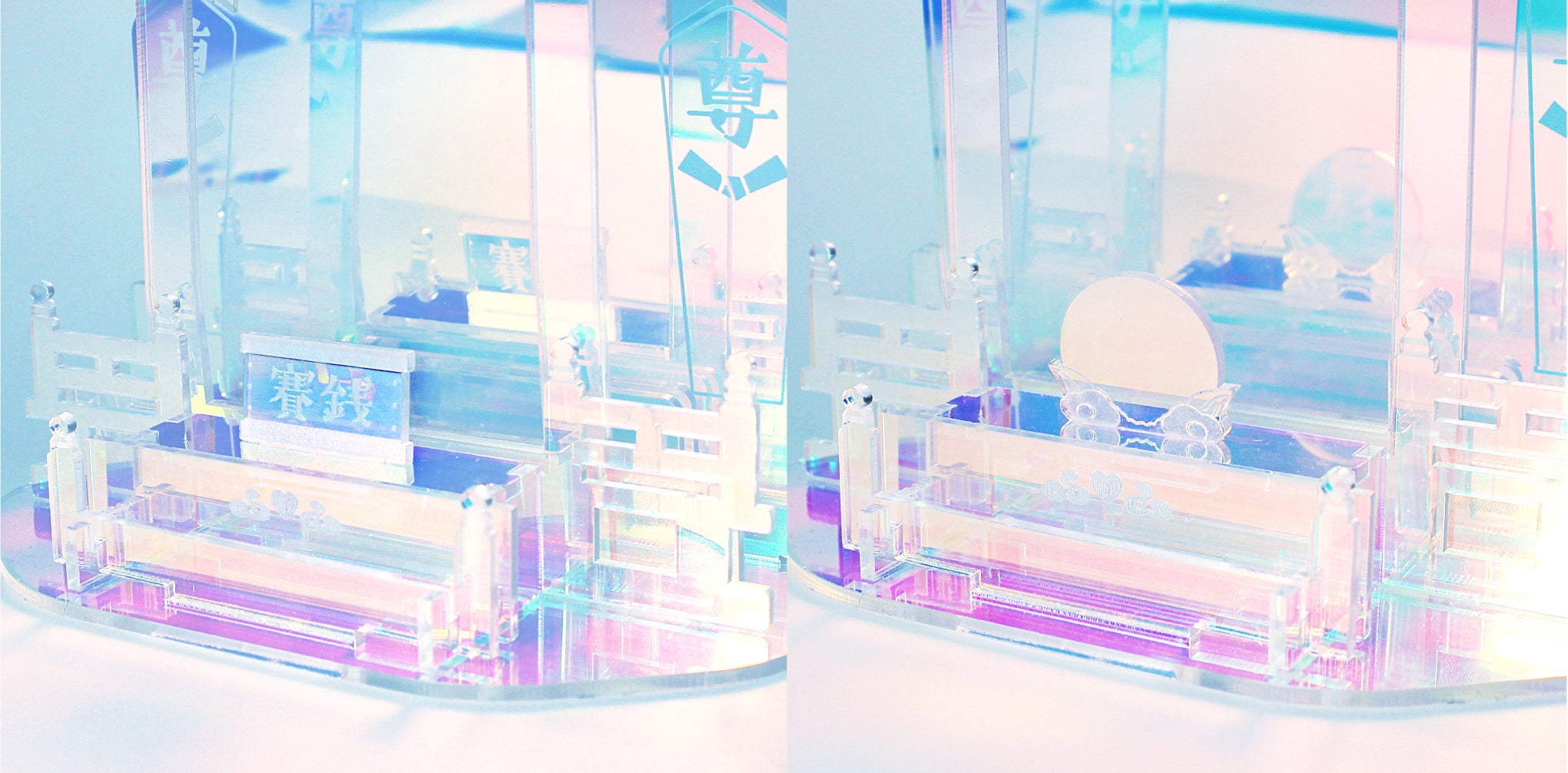 推しの輝きがより一層増す、大好評のオーロラ×アクリル仕様で、お部屋での存在感も圧倒的。推しがオーロラ色に輝く姿は、深いため息がでるほどの尊さです。付属のおまけパーツで、神棚をあなただけの推し仕様にカスタマイズすることができます。