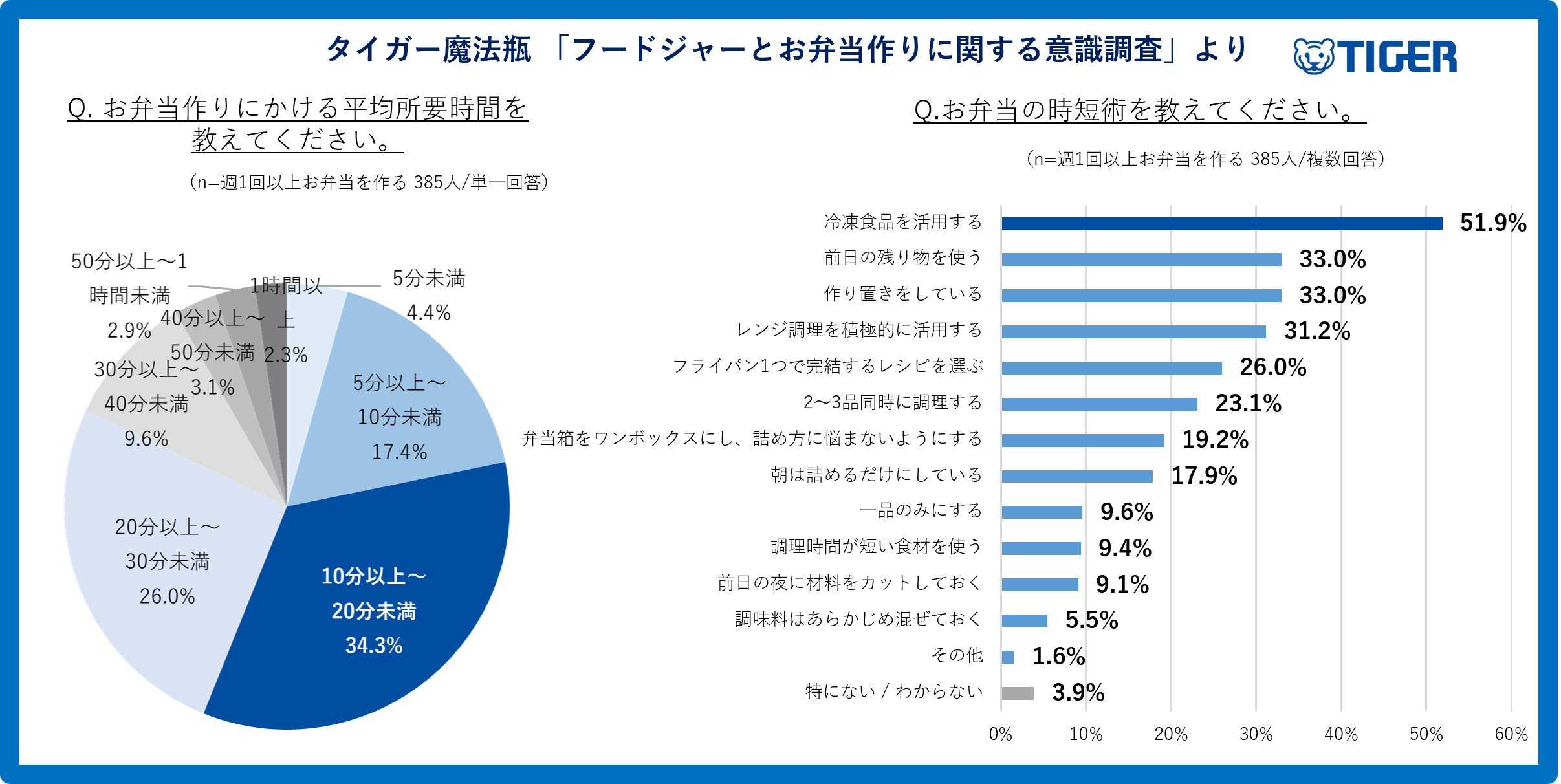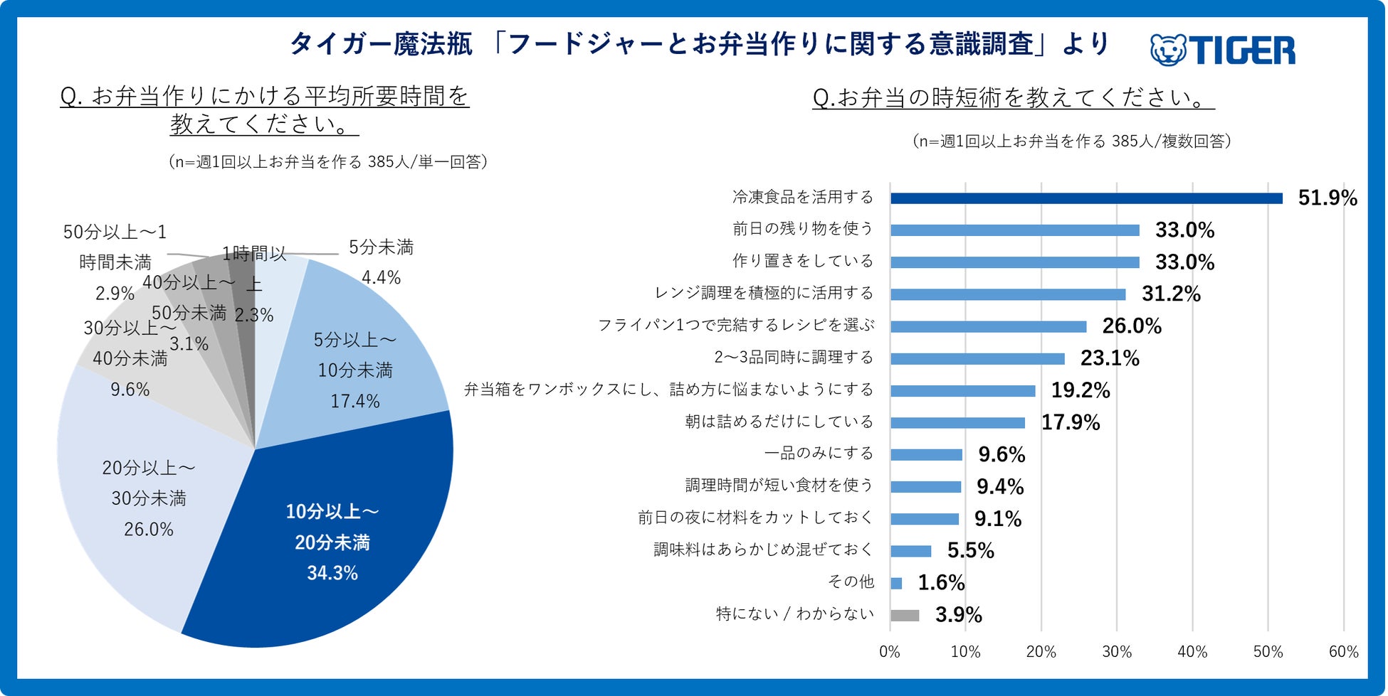 毎朝のお弁当作りにかける時間は10〜20分が最多。お弁当時短術1位は「冷凍食品を活用」。次いで、「前日の残り物を使う」「作り置きする」「レンジ調理を積極的に活用する」が上位に。