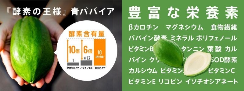 青パパイアは「酵素の王様」と呼ばれるほど豊富な栄養素を含み、一般社団法人日本スーパーフード協会が発表した、「2022食のトレンド予測 スーパーフードランキングTOP10」にてNo.1に輝いた作物。