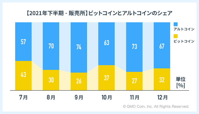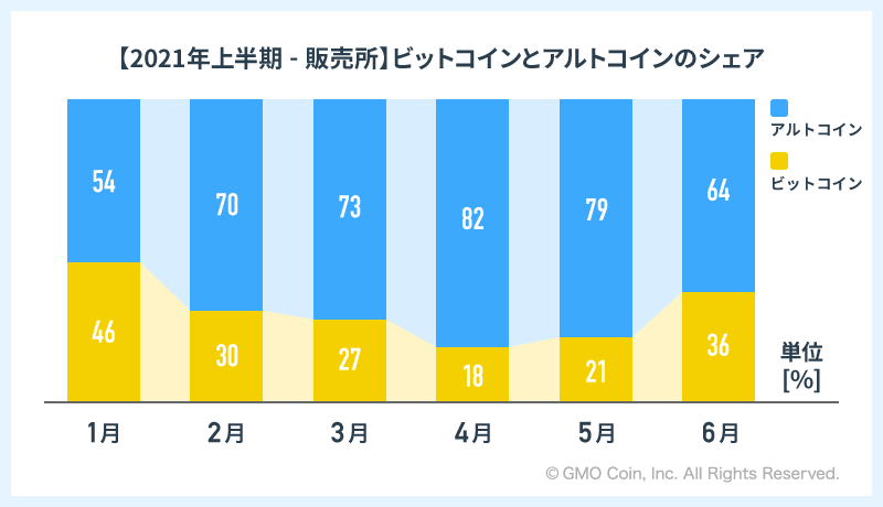 ここからは2021年「販売所」におけるビットコイン(BTC)とアルトコインの月別シェアをご紹介します。