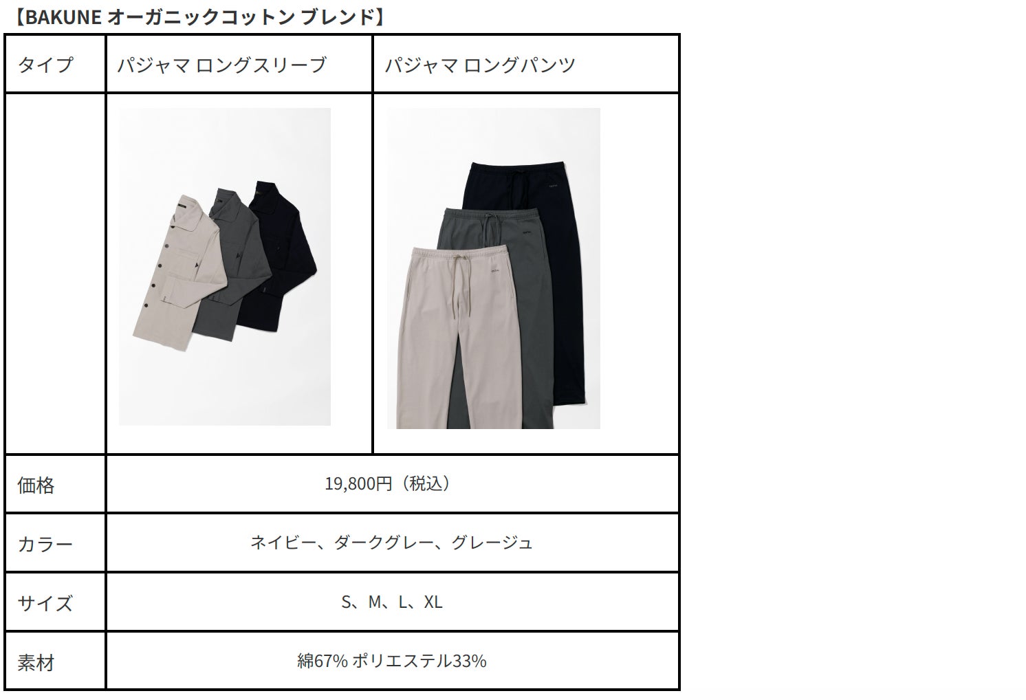 「BAKUNE スムース」は涼しさ・軽さはもちろん、なめらかさ・肌触りにこだわり、モダールの混合率が高いスムース素材を採用し、体をやわらかく包み込む着心地を実現。接触冷感・吸放湿性・高い通気性を兼ね備えた製品です。パジャマタイプとTシャツタイプを展開します。「BAKUNE オーガニックコットンブレンド」は、素材の67%にOCS(オーガニックコンテントスタンダード)認証を取得したオーガニックコットンをブレンドした、やさしい肌あたりの製品です。コットン本来の心地よさを贅沢に活かしながら、かっちりとした質感でシャツライクなデザインに仕上げ、ラウンジシーンにも対応できる上品な佇まいを実現。吸放湿性によるムレ感の軽減と適度な伸縮性も備えた一着です。