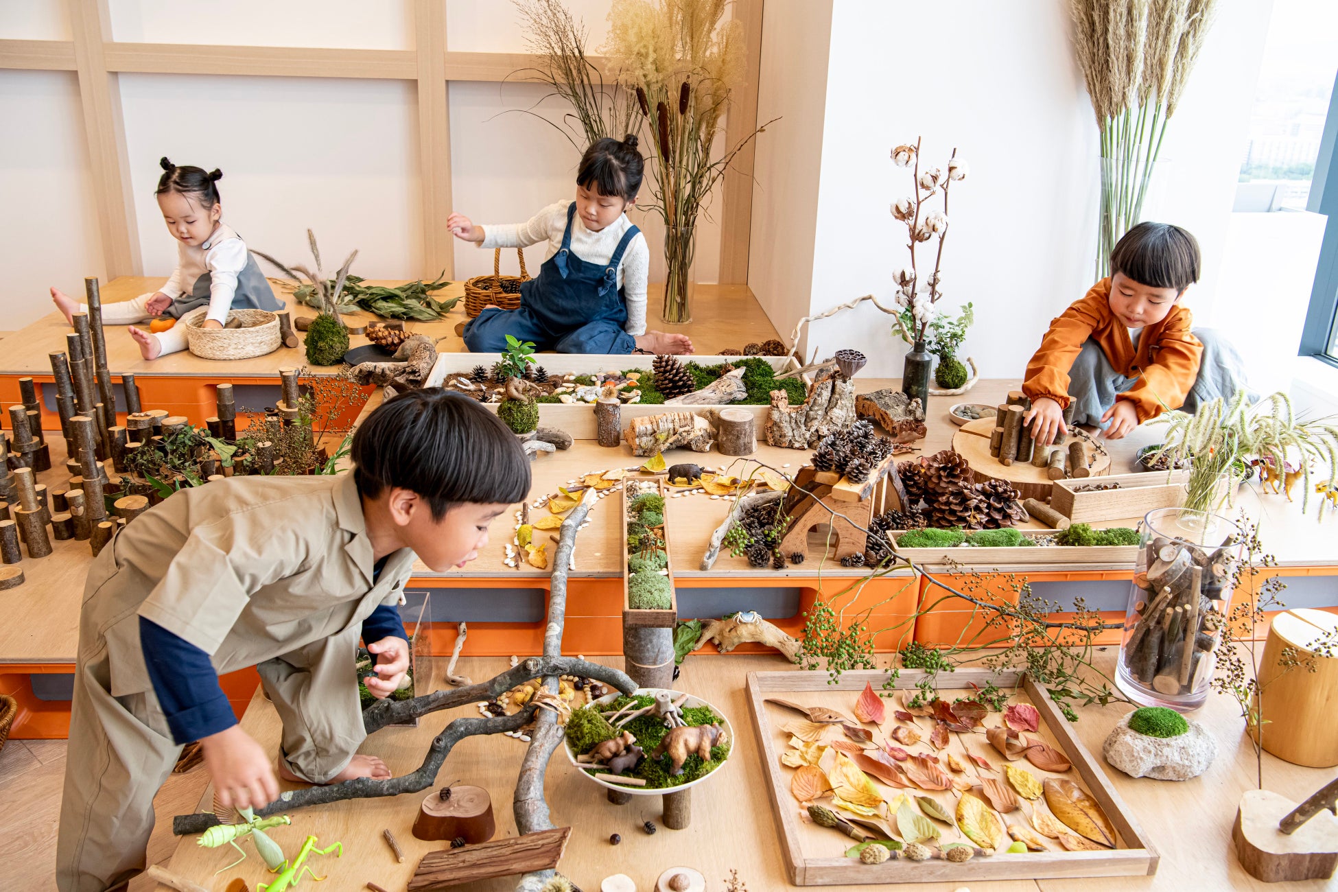 自然物を使ったミニランドスケープデザインが体験できます。土の上に草や苔が生い茂る「土壌」、生き物に欠かせない「水辺」、「木々」とその周りには新しい生命と繋がる「木の実」など。自然物一つ一つの色や形を見つめ直し、自然物の組み合わせ、自然と生き物の関係性を探究します。一人でその世界を深めたり、みんなで協力して大きなフィールドができたり。マイクロスコープを使って「虫の視点」を体験し、そこに棲む新しい生き物をつくって、動かして自分だけのストーリーを制作することもできます。自分で感じ、問いをたて、プロジェクトルームいっぱいの大きなスケールで、自然物を用いて秋の世界を創造します。アトリエでたくさんの自然と触れて探究した子どもたちは、旅から帰っても、街路樹や近隣のさりげない自然物に目を向けた時、自然の色彩や質、形の面白さに気づきやすくなります。