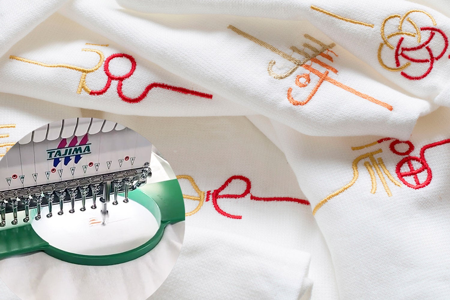 刺繍をくっきり見せる且つ、生地への負担が少なくなるよう刺繍職人が繊細な作業と深い知識でミリ単位で糸が調節され、打ち込んでいます。