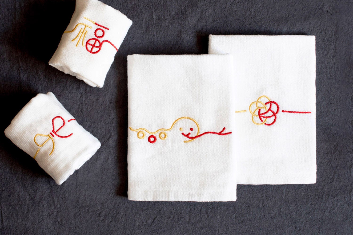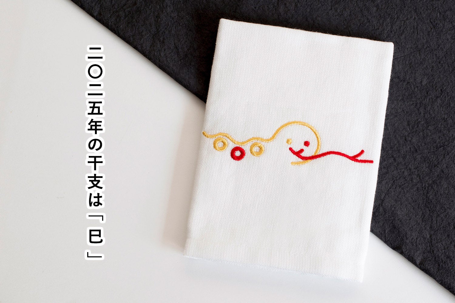 来年の干支、"巳年"にちなんで泉州産のガーゼタオルに刺繍を施し水引をイメージした色味とデザインでポップな柄に仕上げました。