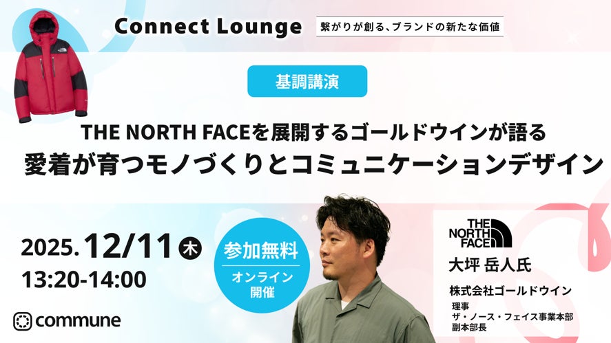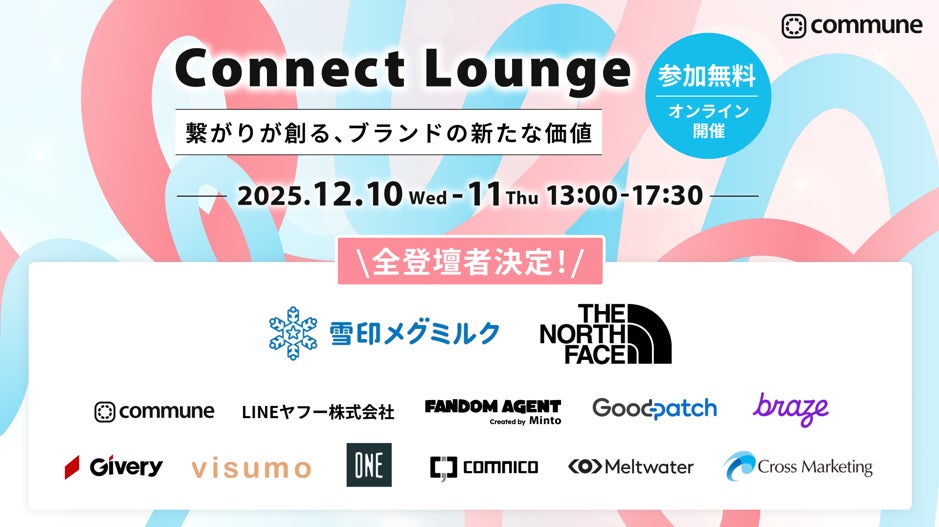 相互交流で信頼を育む「Commune」を提供するコミューン株式会社は、2025年12月10日(水)、11日(木)に開催するオンラインカンファレンス「Connect Lounge 〜繋がりが創る、ブランドの新たな価値〜」(以下、Connect Lounge)において、全ての登壇企業が決まりましたことをお知らせします。