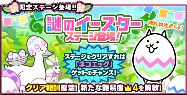 ステージクリアで限定キャラクター「ネコエッグ」を手に入れるチャンスです。