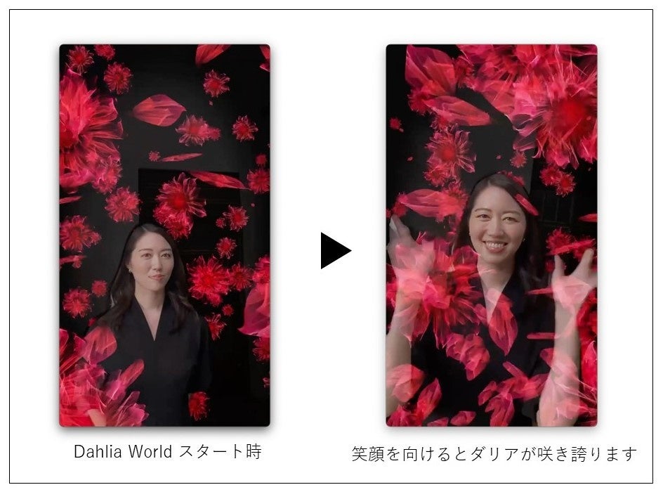デジタル体験「Dahlia World」では、年齢とともに積み上げてきた全ての経験は、今日のあなたの豊かな表情につながっているという想いを込めて、「あなたらしい笑顔が生まれた瞬間に、未来の可能性を応援するダリアが咲き誇る」というインタラクティブなARエフェクト体験をお届けします。