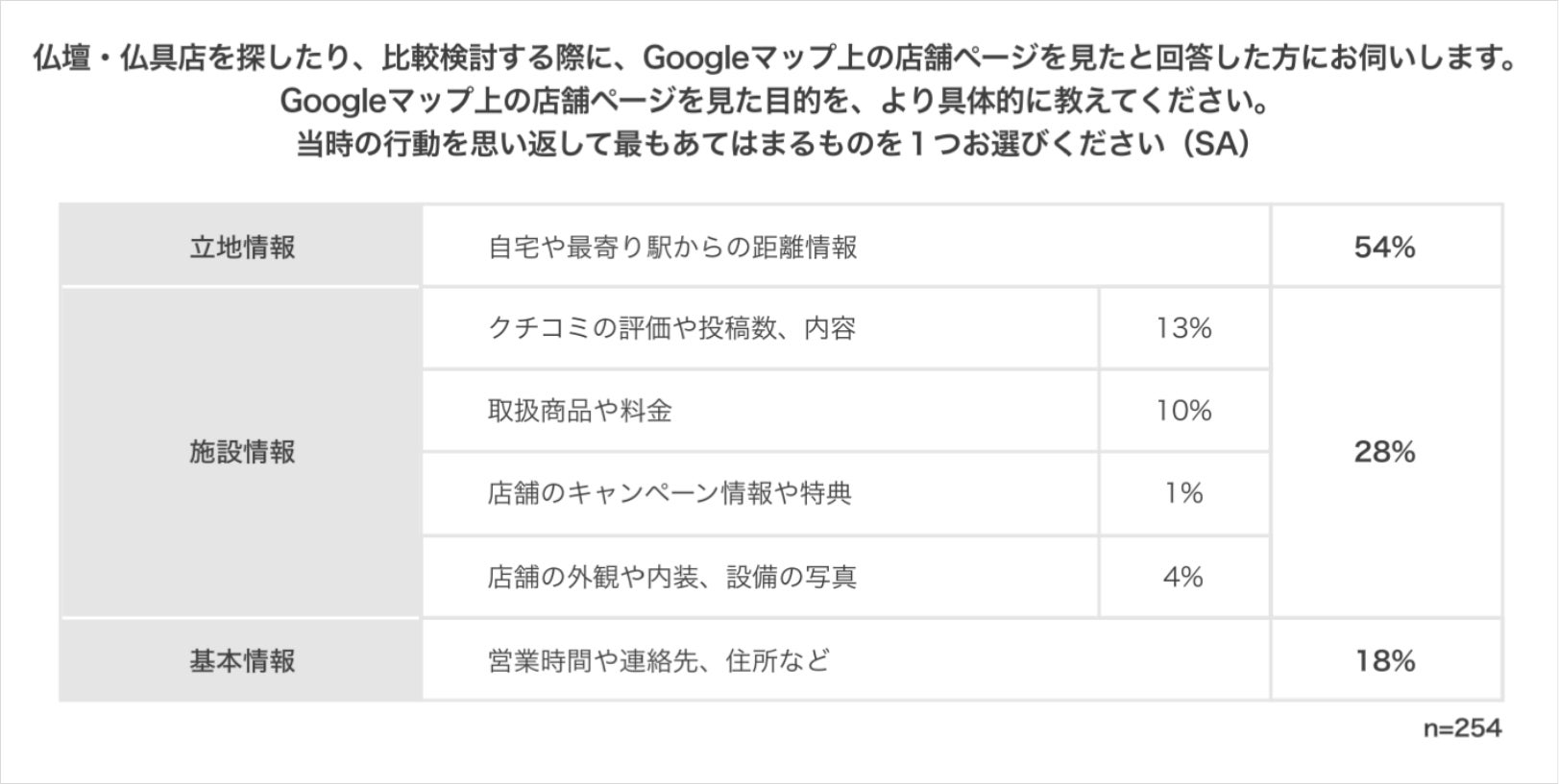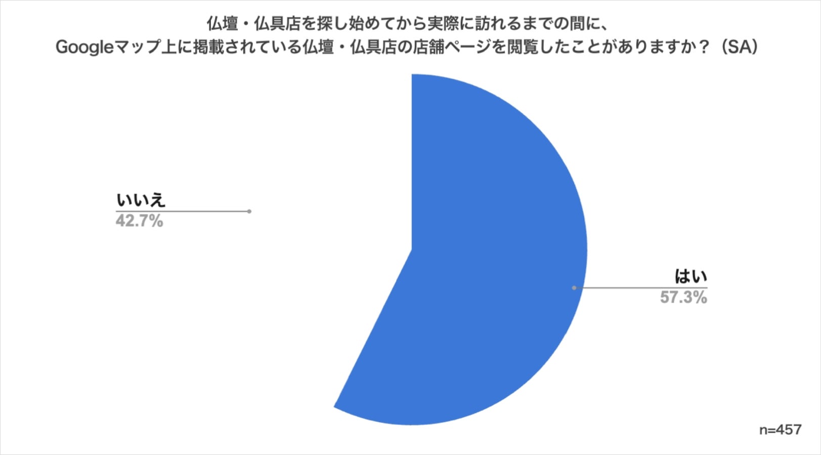 仏壇・仏具店を探し始めてから来店するまでの間に、Googleマップの店舗ページを閲覧した人は57.3%。2人に1人以上が、比較検討や訪問前の情報収集にマップを活用している実態が明らかになりました。