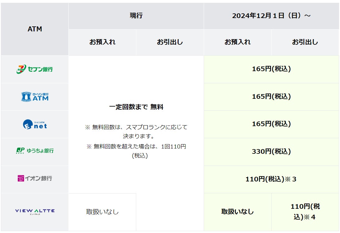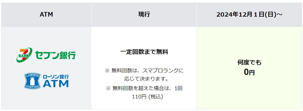 これまでは、スマートプログラムのランクに応じてATMを無料でご利用いただける回数が決まっていましたが、2024年12月1日(日)以降は「アプリでATM」でのATMご利用であれば、ランクに関わらず、いつでも何度でもATM手数料が無料となります。