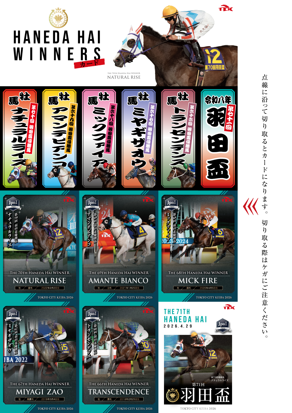 「羽田盃レーシングプログラム」には、付録として過去5年の羽田盃優勝馬を掲載したページを収録。プログラムから切り離していただくことで各馬のメモリアルカードになる仕様です。カードはスマホケースに収まるサイズですので、日頃からお持ちいただける記念品としてもご活用いただけます。