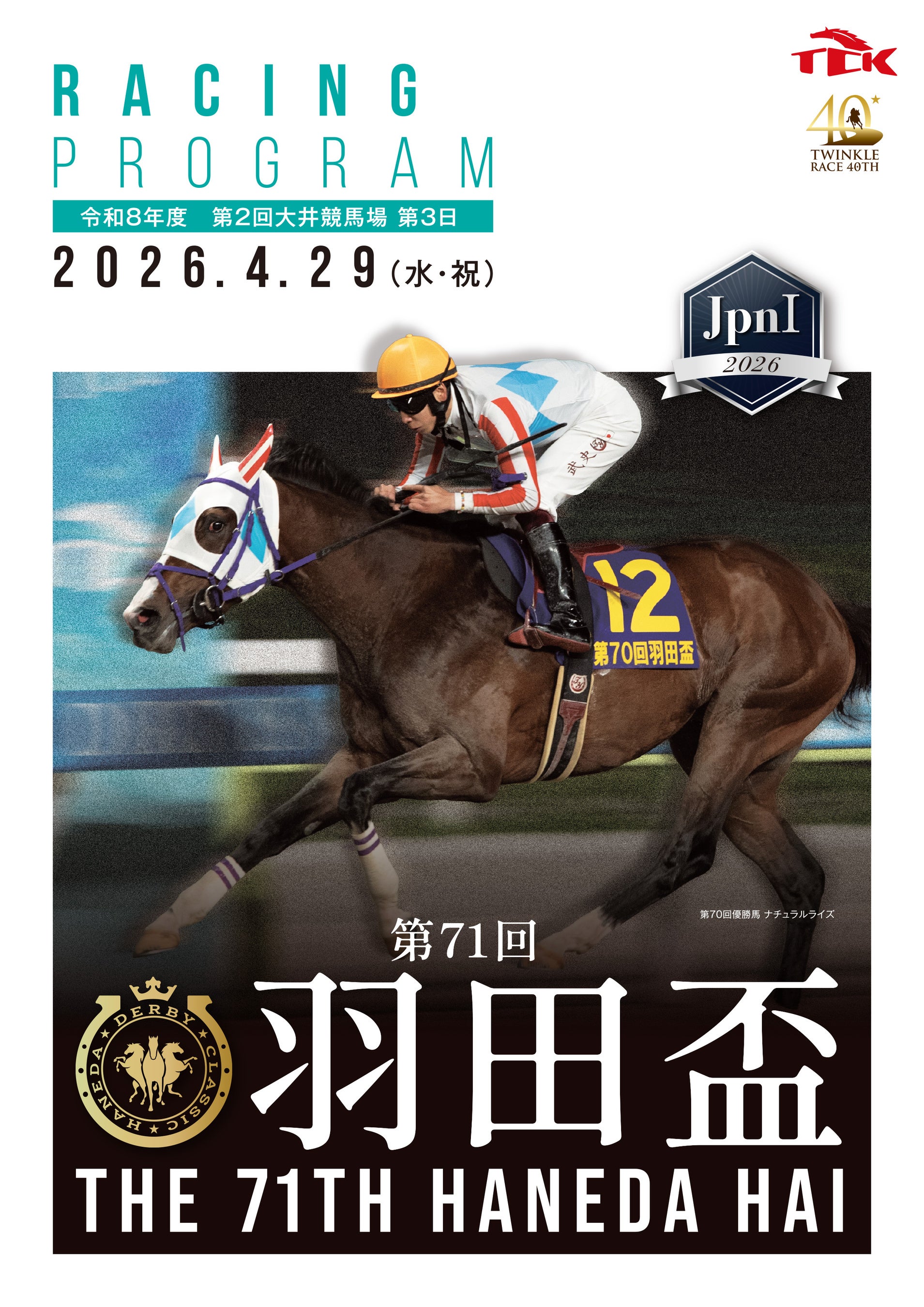 レーシングプログラムの配布は、羽田盃(JpnI)のほか、東京ダービー(JpnI)、帝王賞(JpnI)、ジャパンダートクラシック(JpnI)、東京大賞典(GI)当日も予定しています。トゥインクルレース40周年を記念した新レーシングプログラムにぜひご期待ください!