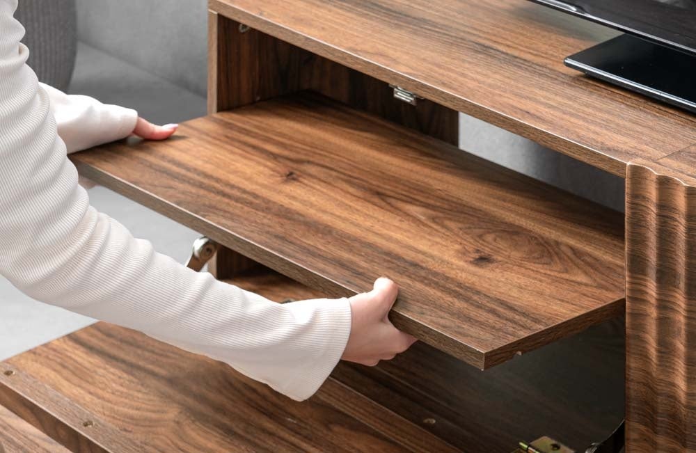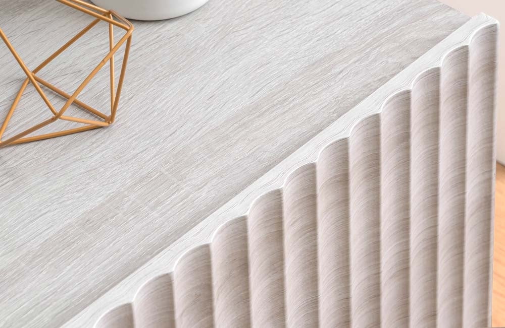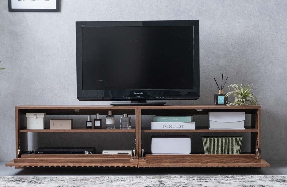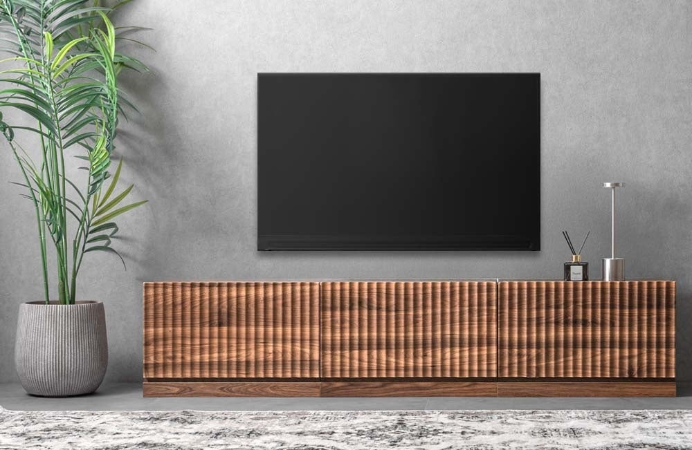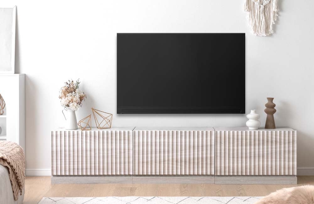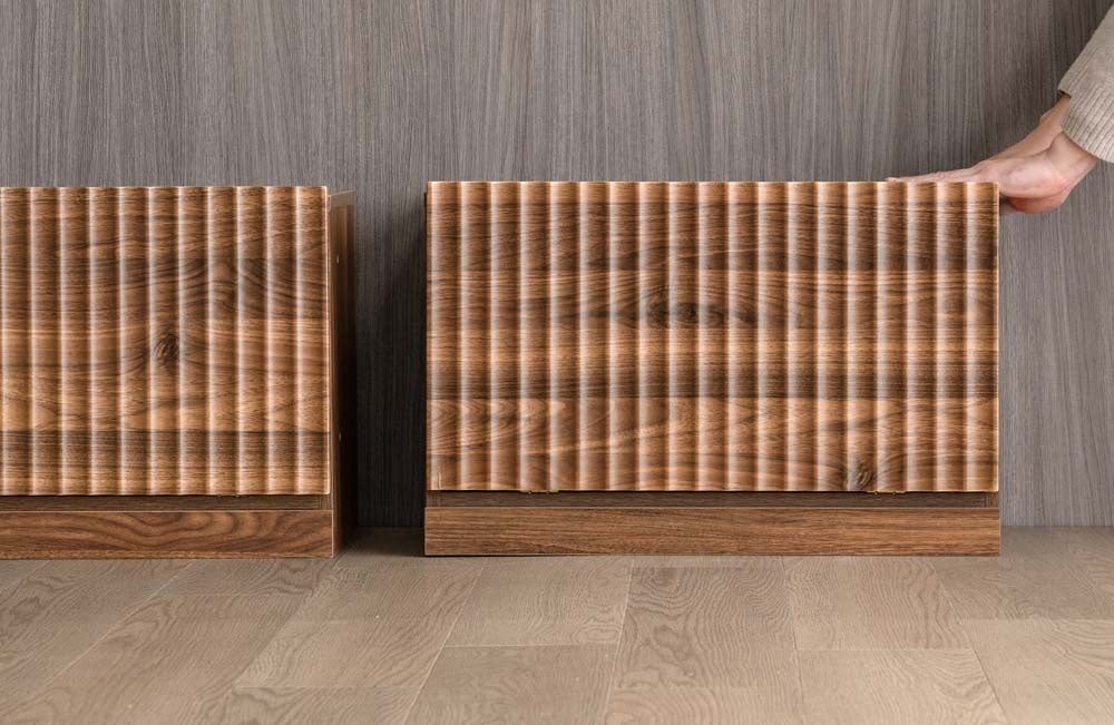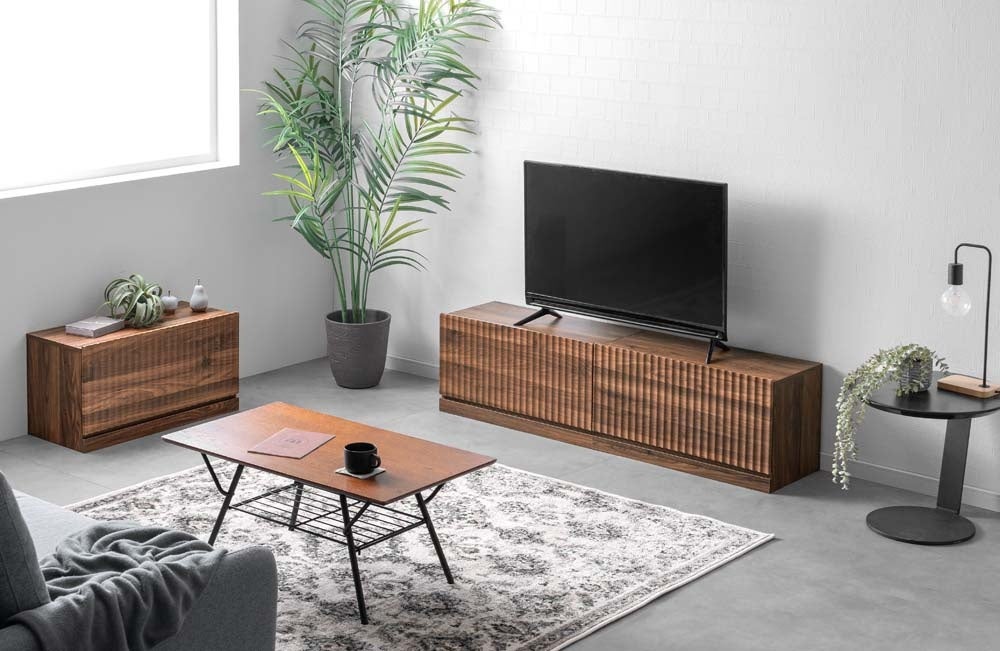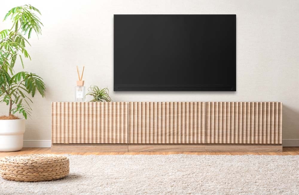 前板には波状の立体デザインを採用することにより、光の当たり方で陰影が生まれ、シンプルながらも上質なデザインに仕上げています。波状の縦ラインが同じ間隔で続くことで、複数台つなげても継ぎ目が目立ちにくく、まるで1台のテレビ台のような統一感のあるデザインです。
