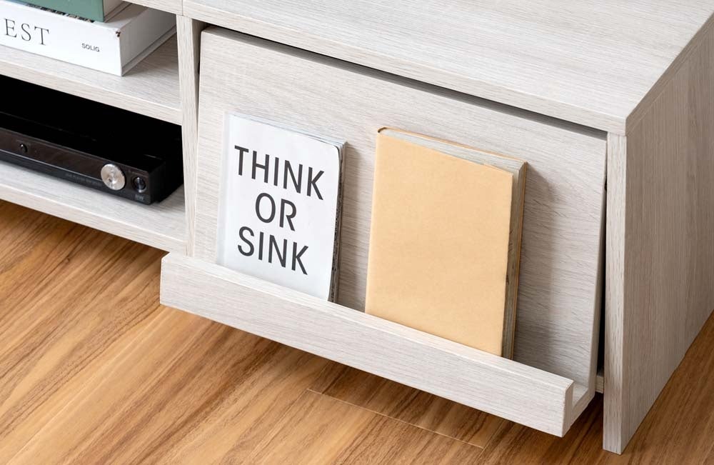 前板の扉付き収納には、小物や雑貨をまとめて収納できます。リモコン類やゲーム機、周辺機器等生活感の出やすいものを隠し、収納することができます。棚板は3段階で高さを変えることができる可動棚を採用しているので、収納物の高さに合わせて自由に調整することや、棚板を取り外し、1つの広い収納スペースとして使用することもできます。