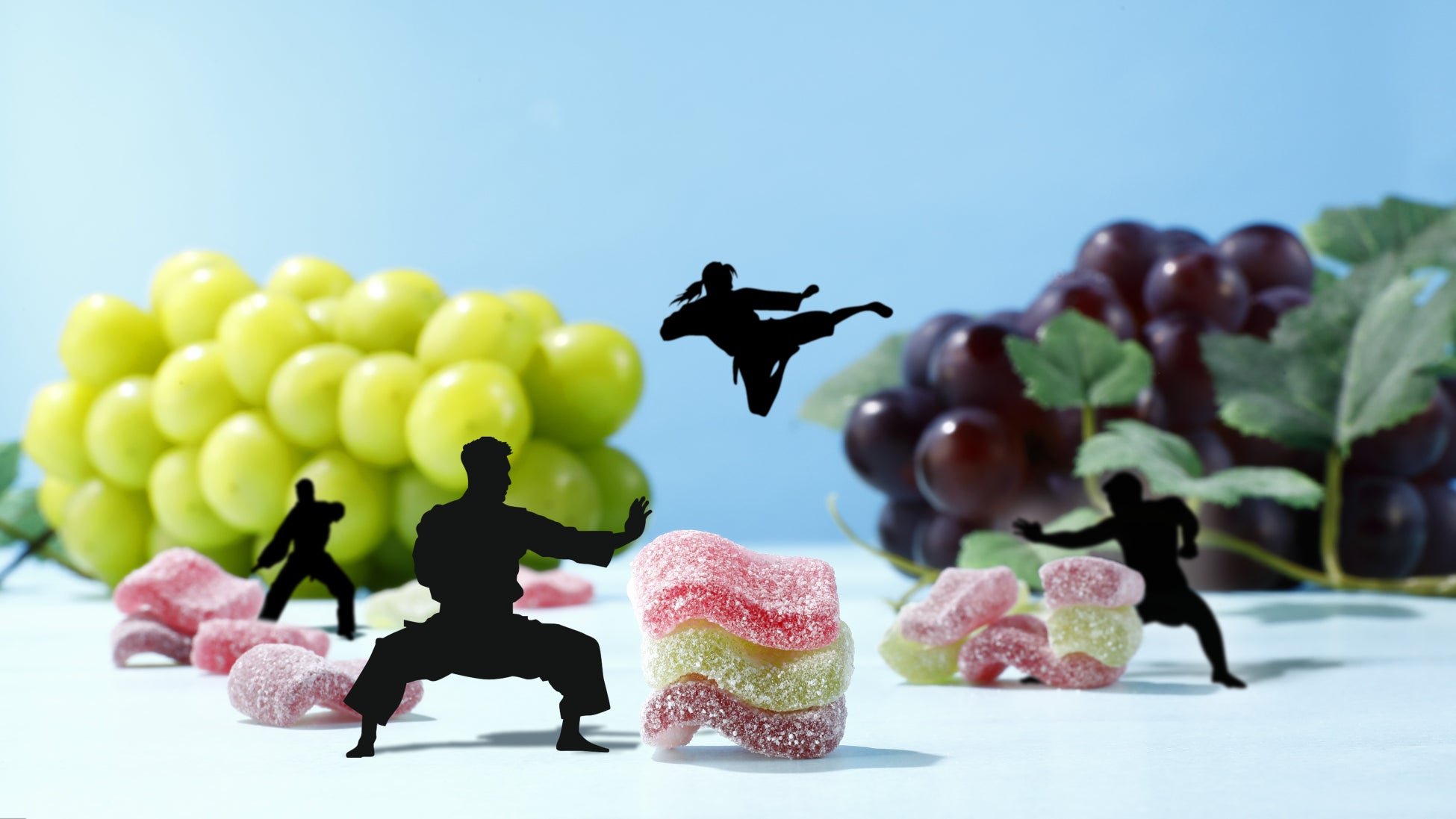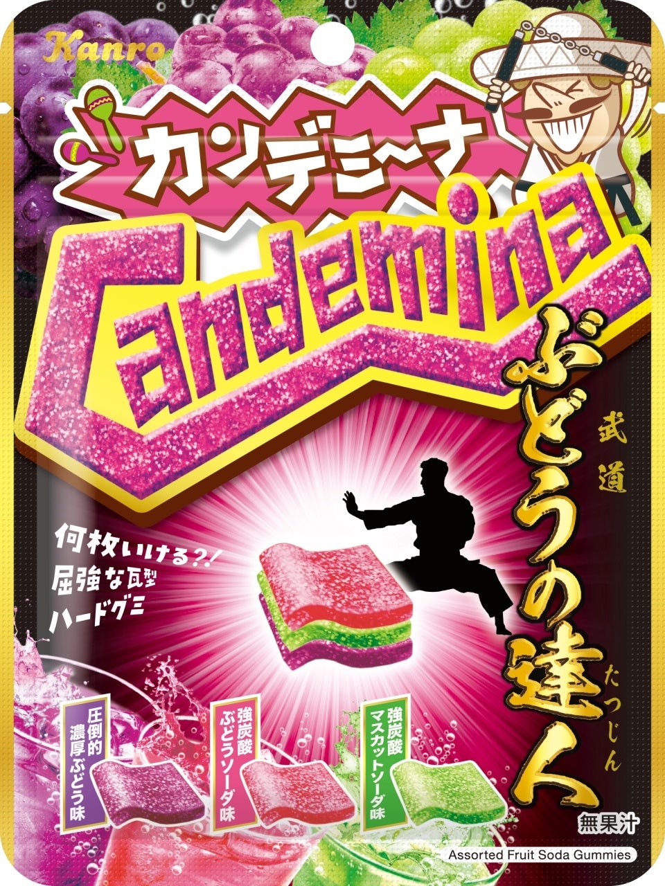 パッケージはカンデミーナらしい、元気と楽しさあふれるデザイン。「ぶどう」と「武道」をかけた商品名にちなみ、“武道の達人”が重ねられた瓦型のグミに挑む姿を表現しています。日常のおやつや小腹満たしに、ハードな食感とジューシーな味わいが魅力のカンデミーナグミをぜひお召し上がりください。