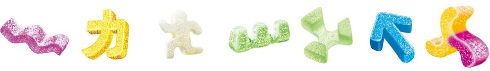 波型、パズル型、矢印型、力型、これまでに類を見ない3Dなグミ型が作り出すどこか不思議な食感は、食べた人を虜にすること間違いなし!?