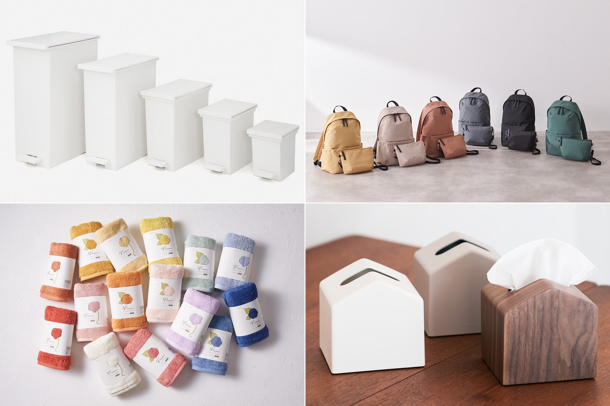 メディアで何度も取り上げられ、累計販売台数70万台を突破した「arrotsダストボックス」「KEYUCAダストボックスLL」、シリーズ累計販売数7万個以上を突破した機能性抜群「N撥水ライトシェルリュックM」、食卓の上はもちろん、洗面などの水回りでも安心して使え、累計販売数20万個以上売れている大ヒット中の「Moi コンパクトティッシュケース」、花の色をテーマにしギフトにもおすすめ「抗菌防臭Greetingフェイスタオル」など、便利で機能的な商品が目白押し。