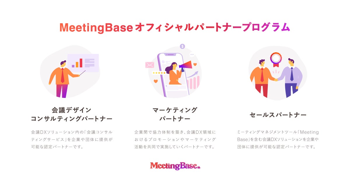 MeetingBaseオフィシャルパートナープログラムは、下記3つのパートナープログラムに分かれており、各パートナー企業に最適な支援内容を用意しています。