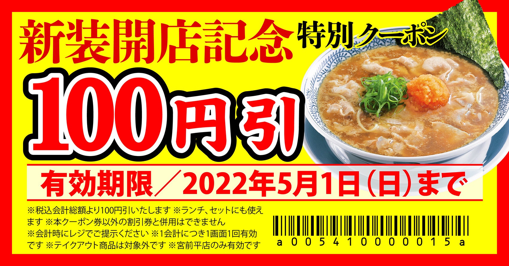 オープン記念として、2022年5⽉1⽇(日)までご利⽤いただける『丸源ラーメン 宮前平店』限定の100円引クーポンをwebにて配信いたします。