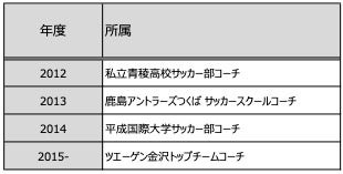 私立青稜高校サッカー部コーチ - 鹿島アントラーズつくば サッカースクールコーチ - 平成国際大学サッカー部コーチ - ツエーゲン金沢トップチームコーチ