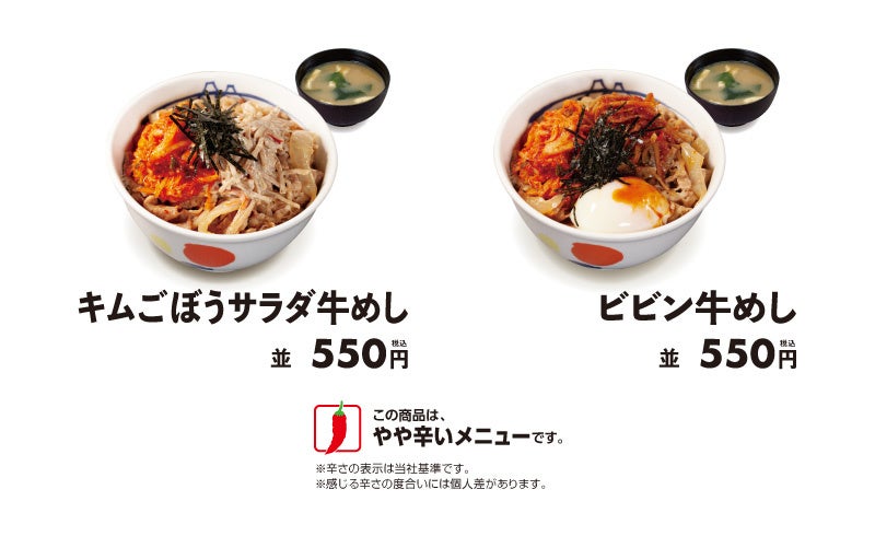 | 商品名 キムごぼうサラダ牛めし 550円 ビビン牛めし 550円 ※お持ち帰りいただけます。お持ち帰りにみそ汁は付きません。 お持ち帰りの場合、みそ汁は別途60円でお求めいただけます。 ※全て税込み価格です。また、店内・お持ち帰りの税込価格は同一です。 発売日 2022年7月5日(火)午前10時 ~ 対象店舗 一部店舗を除く全国の松屋 |