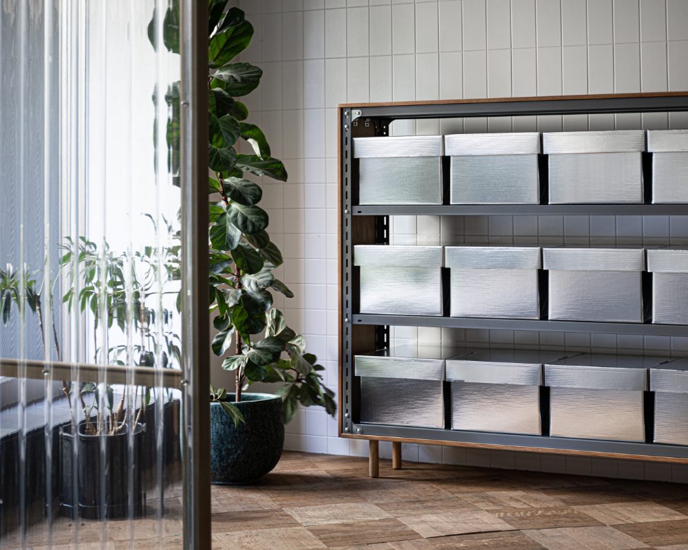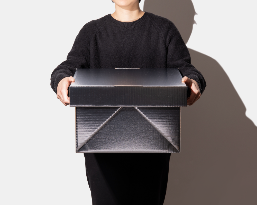 CARTON 2.0のマテリアルは、ダンボール原紙にPETアルミ蒸着フィルムがラミネートされた(株)アイザック製「クールダン」。フィルムの特性と断面の空気層を活かし、ダンボールに「保冷効果」「耐水効果」「防湿効果」を持たせています。廃棄する際は焼却処理可能でダイオキシンが発生しません。