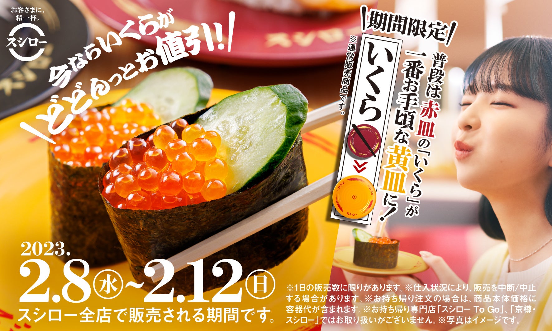 株式会社あきんどスシロー(本社:大阪府吹田市、代表取締役社長:新居 耕平)は、2月8日(水)から12日(日)の5日間限定で、スシローこだわりの「いくら」を普段赤皿の180円(税込)※2 でご提供しているところ、黄皿の120円(税込)※3 にてご提供いたします。