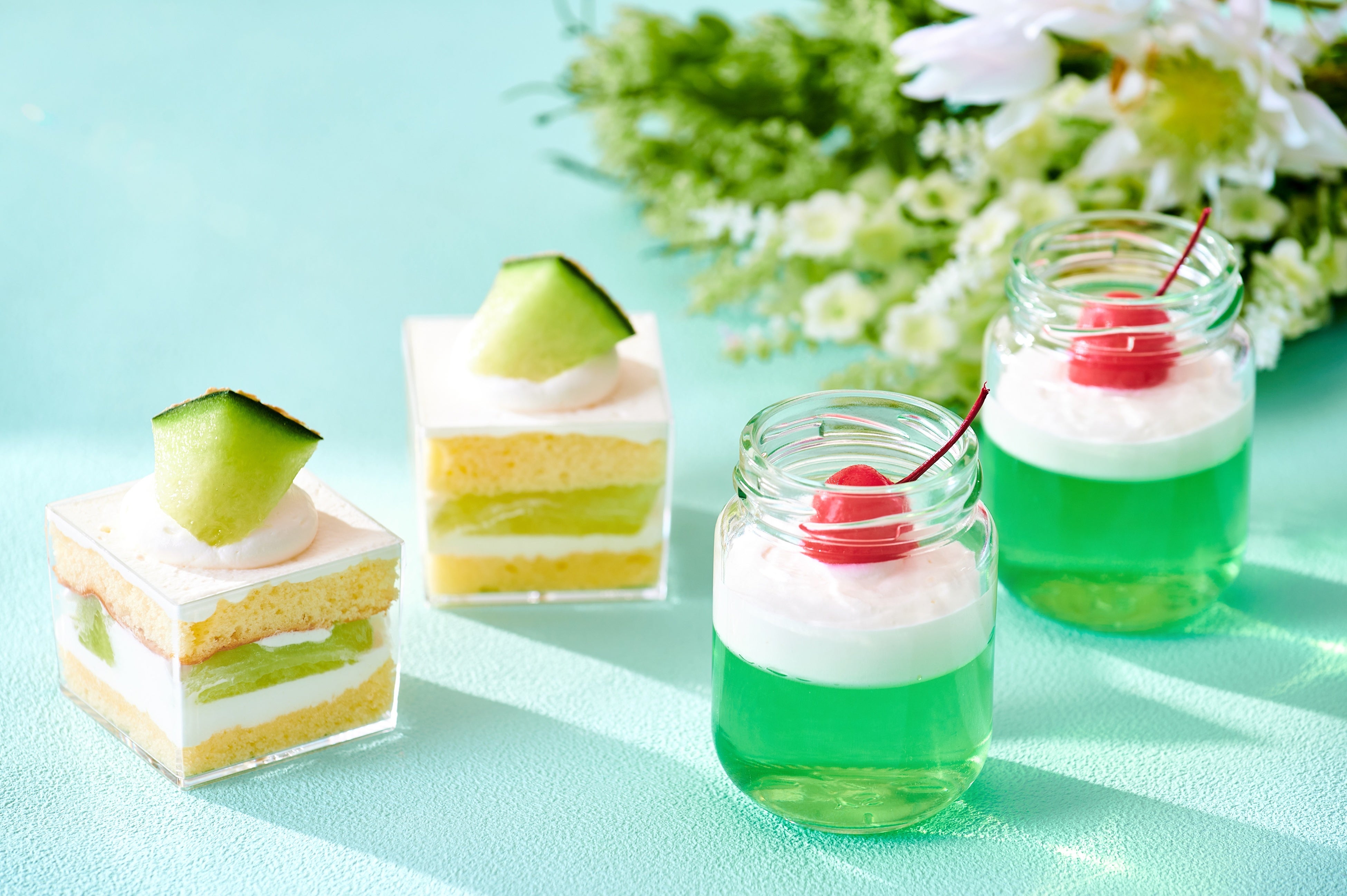 瑞々しいフルーツの果実味をご堪能いただけるメロンショートケーキやメロンサンドイッチ、シャインマスカットフロマージュブランなどのほか、メロン型のムースやレトロなメロンソーダをイメージしたメロンソーダゼリーなど、目でも舌でも楽しめる夏限定のスイーツとセイボリーが華やかに並びます。