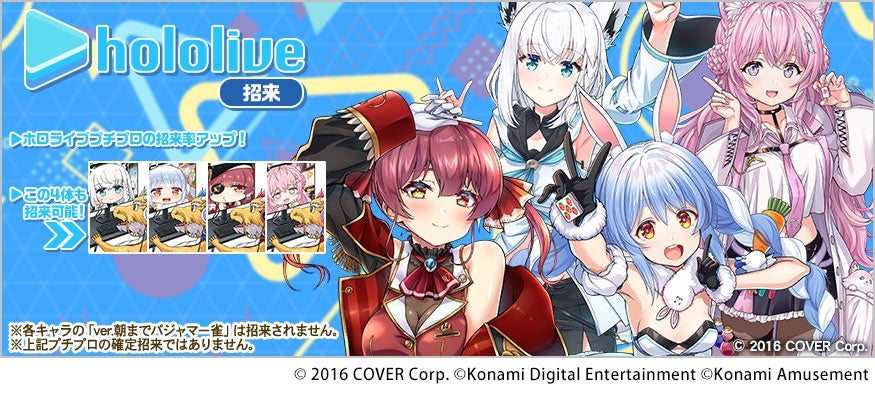 イベント期間中、「ホロライブ」所属の人気タレント「白上フブキ(しらかみふぶき)」、「兎田ぺこら(うさだぺこら)」、「宝鐘マリン(ほうしょうまりん)」、「博衣こより(はくいこより)」の4名が新規描き下ろしイラストや録り下ろしボイスで「ホロライブプチプロ」として登場します。さらに、それぞれのプチプロを入手すると、各タレントに対応した「Ver.朝までパジャマー雀」プチプロ1体を必ず入手できる10連招来も解禁します。