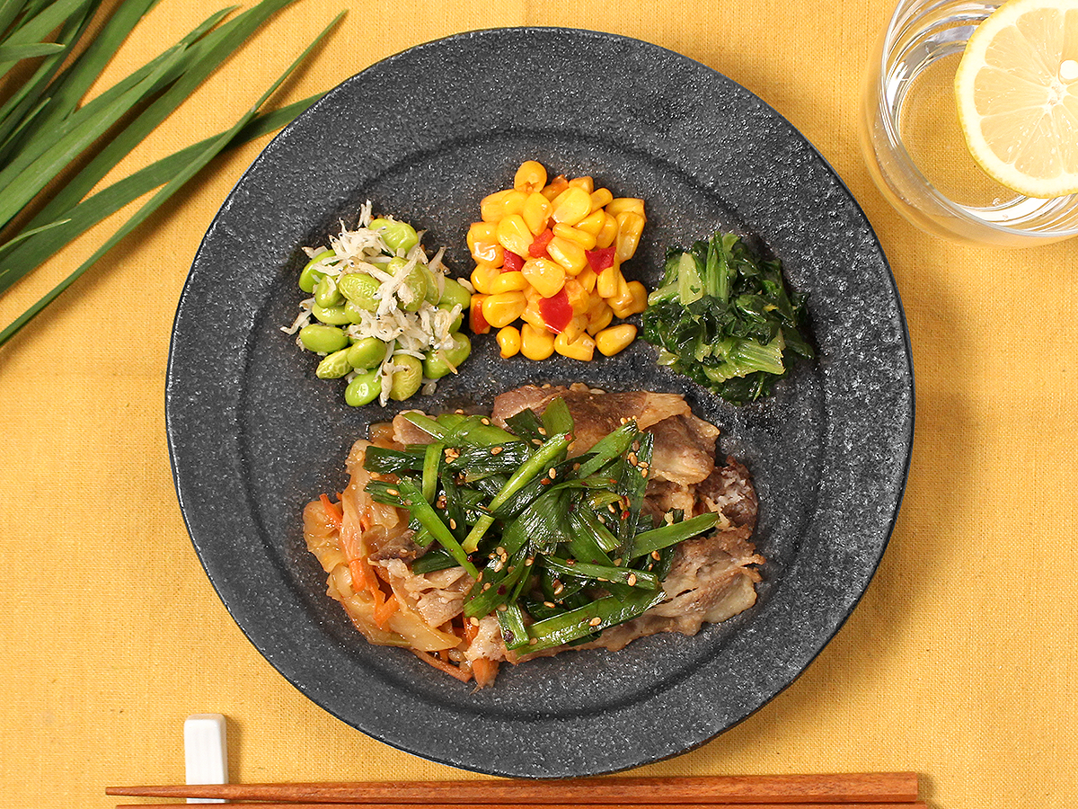 副菜は、シラス入りの枝豆サラダ、コーンのコチュジャンあえ、しろ菜のナムルです。