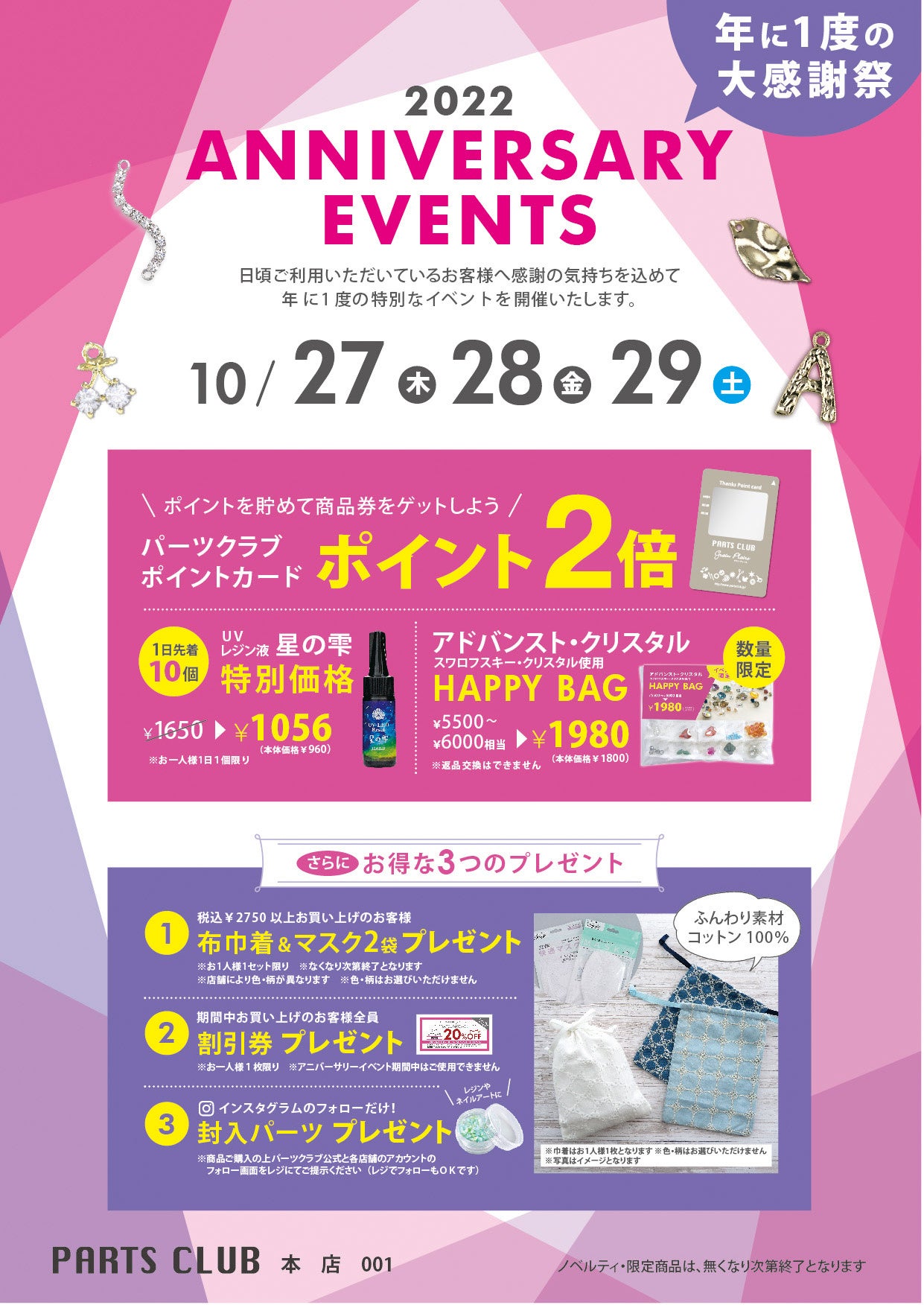 ビーズ&アクセサリーパーツショップPARTS CLUBの旗艦店「本店」がANNIVERSARY EVENTS開催。 10/27(木)・28(金)・29(土)特別な3日間!