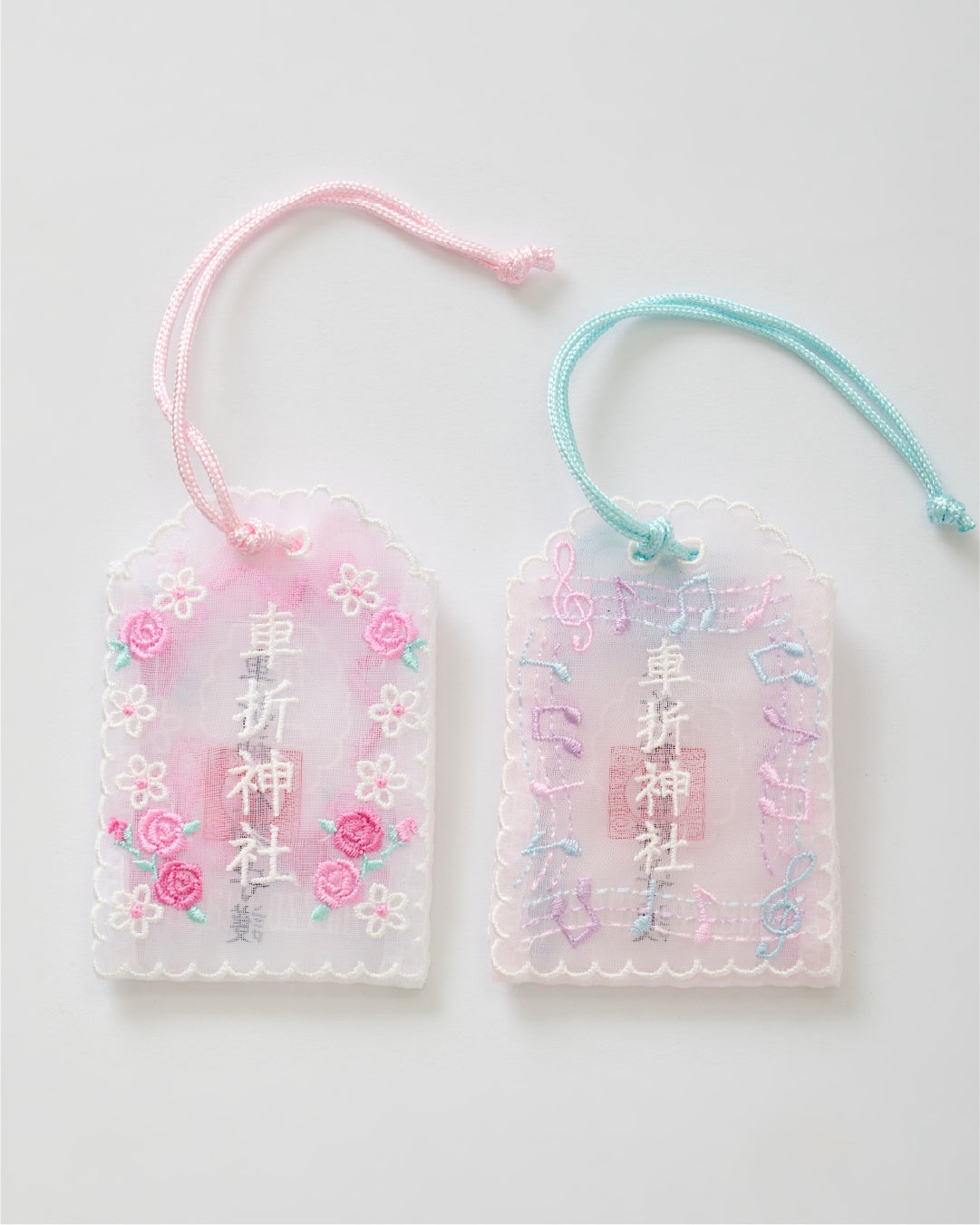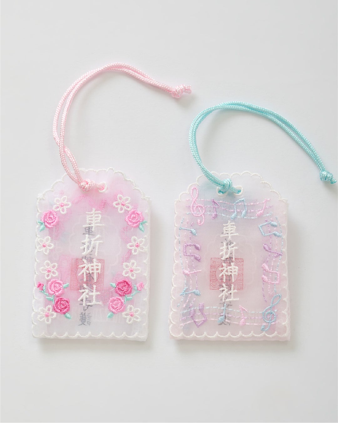 オーガンジーの透けた生地にトゥシューズモチーフと音符モチーフの繊細な刺繍を施し、御神体にも透明なアクリルを採用し繊細な透け感が出る様仕上げました。